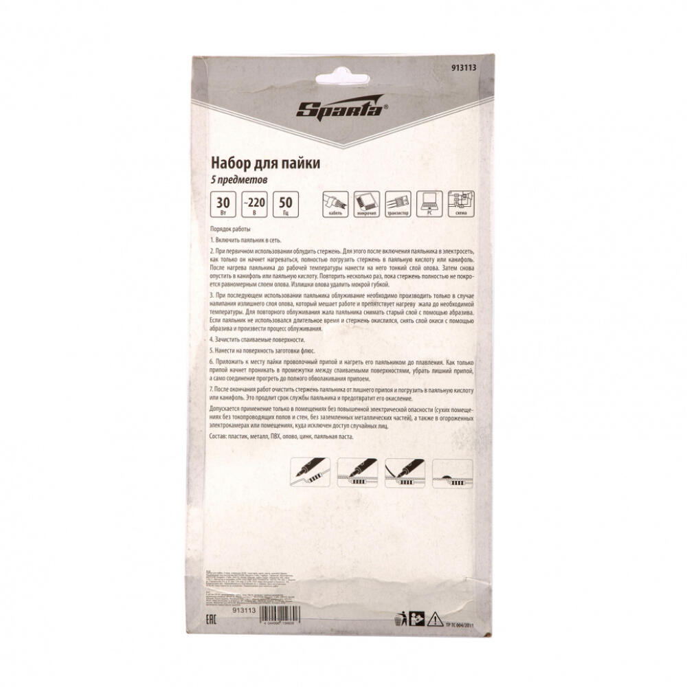 Набор Sparta 913113 предназначен для пайки электронных компонентов и состоит из 5 предметов — паяльника мощностью 30 Вт, подставки, жала, пасты и припоя. Благодаря наличию в комплекте всех необходимых элементов можно приступать к работе сразу после покупки. Нагревательный элемент паяльника — устойчивая к повреждениям нихромовая спираль, что снижает риск поломки прибора в результате случайного удара или падения. Конусовидное жало удобно для пайки мелких деталей. Набор пригодится для ремонта электроники и бытовой техники.