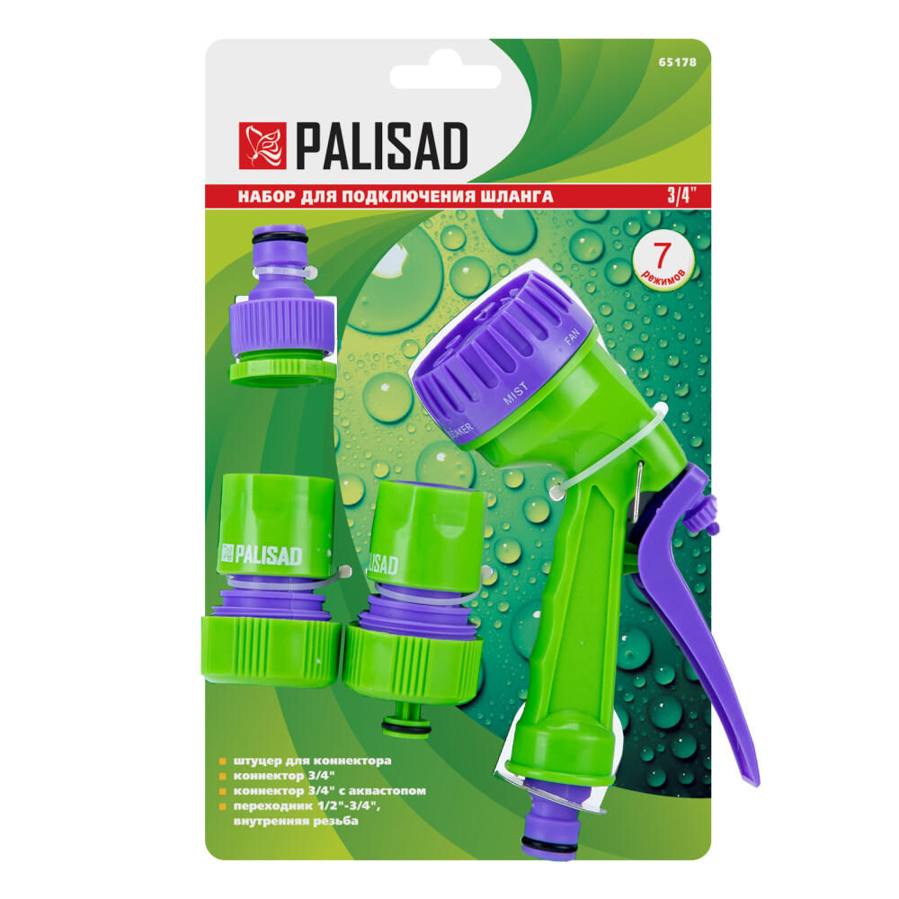 Набор для подключения шланга диаметром 3/4" Palisad 65178 включает пистолет с 7 режимами разбрызгивания, адаптер и 2 соединителя. Предназначен для организации системы орошения. Коннектор с функцией «аквастоп» останавливает подачу воды при отсутствии соединения с пистолетом. Элементы набора могут использоваться со всеми оросительными системами линеек Palisad и Palisad Luxe. Комплект пригодится для ухода за растениями на дачном участке.
