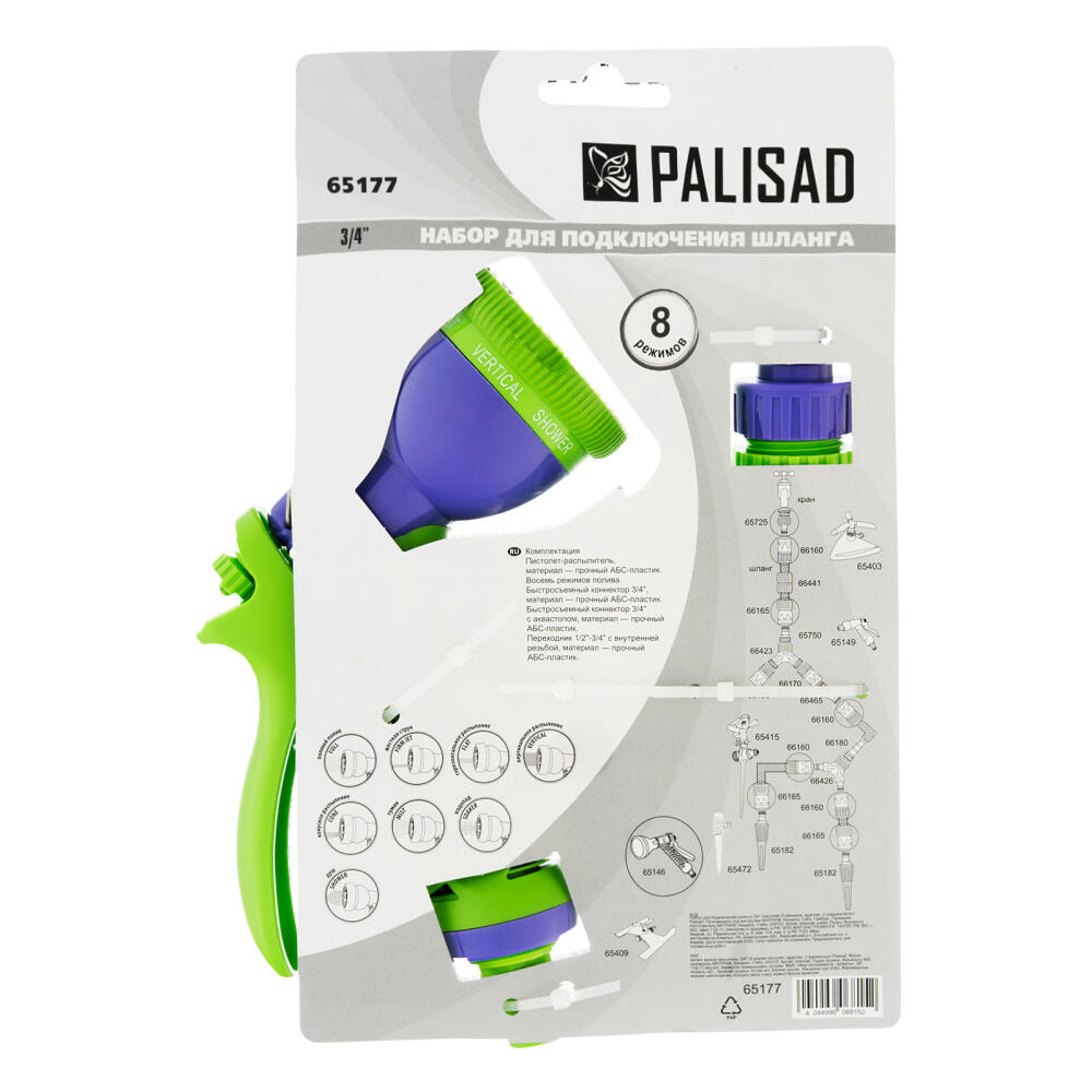Набор для подключения шланга диаметром 3/4" Palisad 65177 включает в себя пистолет с 8 режимами полива, адаптер и 2 соединителя. Используется для орошения растений в саду и огороде. Шланг присоединяется к распылителю и отсоединяется от него за несколько секунд благодаря быстросъемному коннектору. Это позволяет подобрать оптимальную интенсивность распыления для каждого вида растений. Адаптер-переходник служит для подключения шланга к кранам диаметром 1/2" и 3/4". Все элементы комплекта совместимы с поливочными системами Palisad и Palisad Luxe.