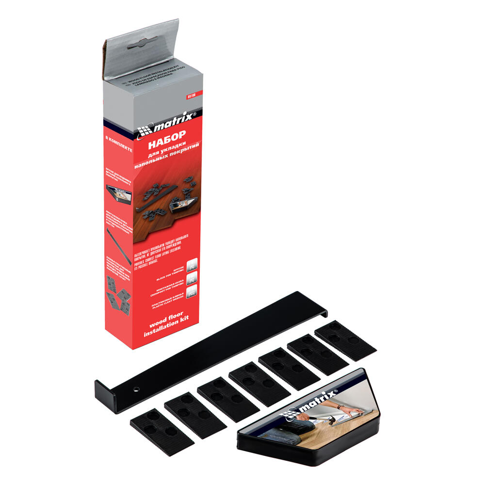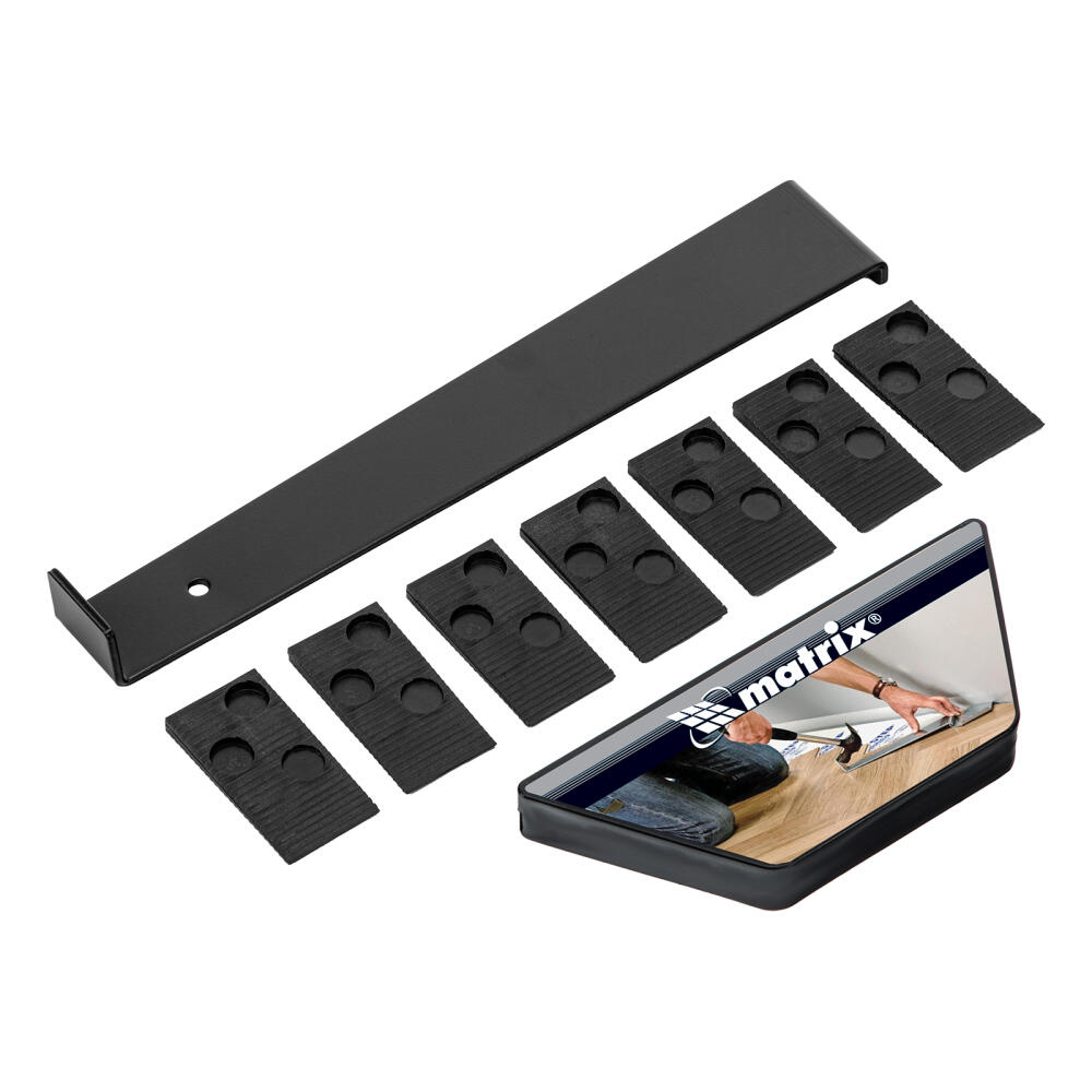 Набор Matrix 88100 предназначен для правильной укладки напольных покрытий без дефектов и повреждений. Набор включает все необходимое для монтажа: распорные клинья, брусок и скобу. Клинья позволяют точно выровнять первый ряд и отрегулировать зазор между панелями и стеной. При помощи скобы можно подбить последний ряд для плотной усадки. Брусок защищает замок панелей, если нужно подбить стыки молотком.