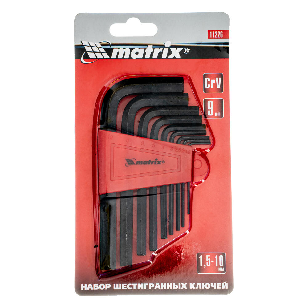 Набор Matrix 11226 из 9 коротких оксидированных имбусовых ключей размером 1,5-10 мм, из стали CrV, используется для монтажа и демонтажа крепежа со шлицем HEX. Шестигранники наиболее часто применяются для закручивания мебельных евровинтов и ремонта велосипедов. Г-образная форма ключей позволяет использовать их длинные части в качестве рабочих для удобного доступа в труднодоступные места.