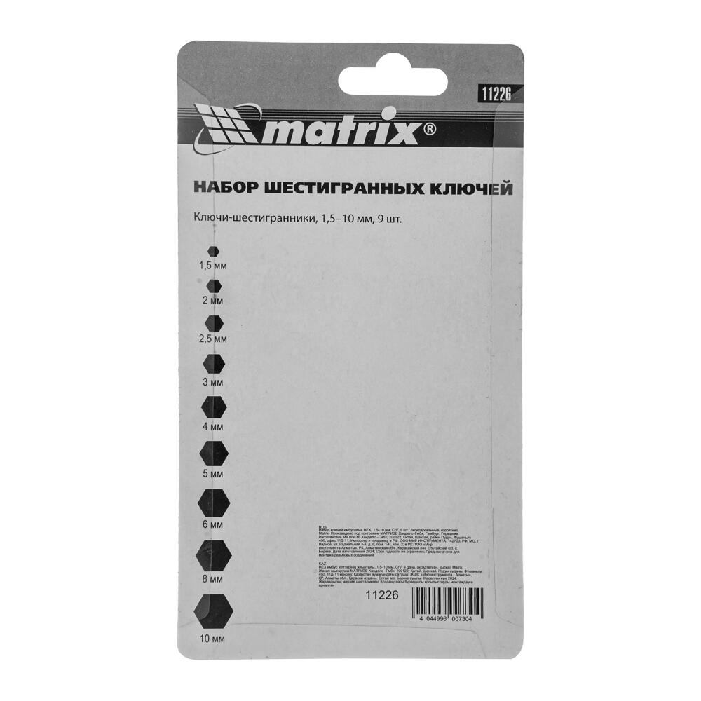 Набор Matrix 11226 из 9 коротких оксидированных имбусовых ключей размером 1,5-10 мм, из стали CrV, используется для монтажа и демонтажа крепежа со шл...