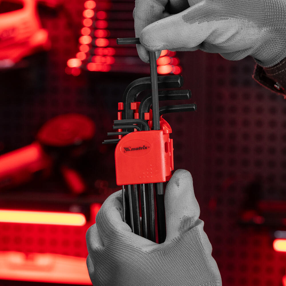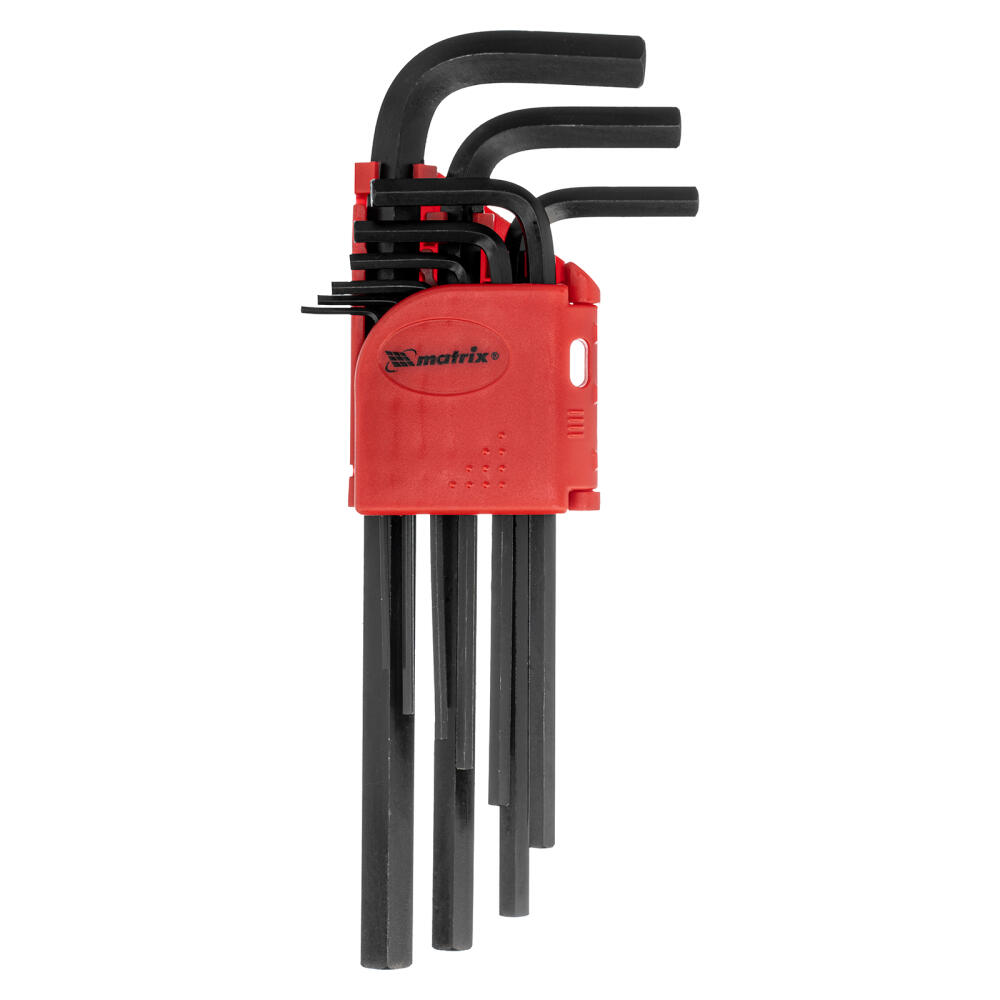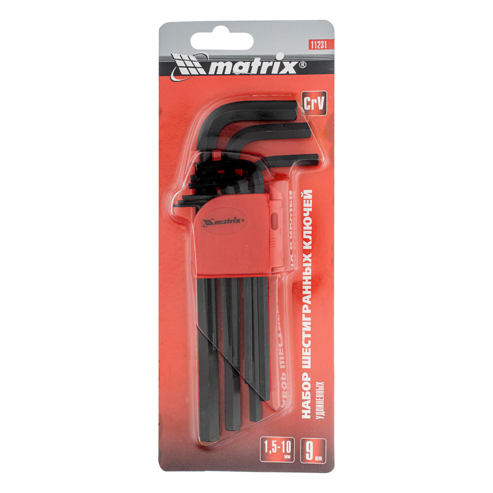 Набор Matrix 11231 из 9 удлиненных оксидированных имбусовых ключей размером 1,5-10 мм, из стали CrV, используется для монтажа и демонтажа крепежа со шлицем HEX. Шестигранники наиболее часто применяются для закручивания мебельных евровинтов и ремонта велосипедов. Удлиненные рабочие части обеспечивают удобный доступ в труднодоступные места.