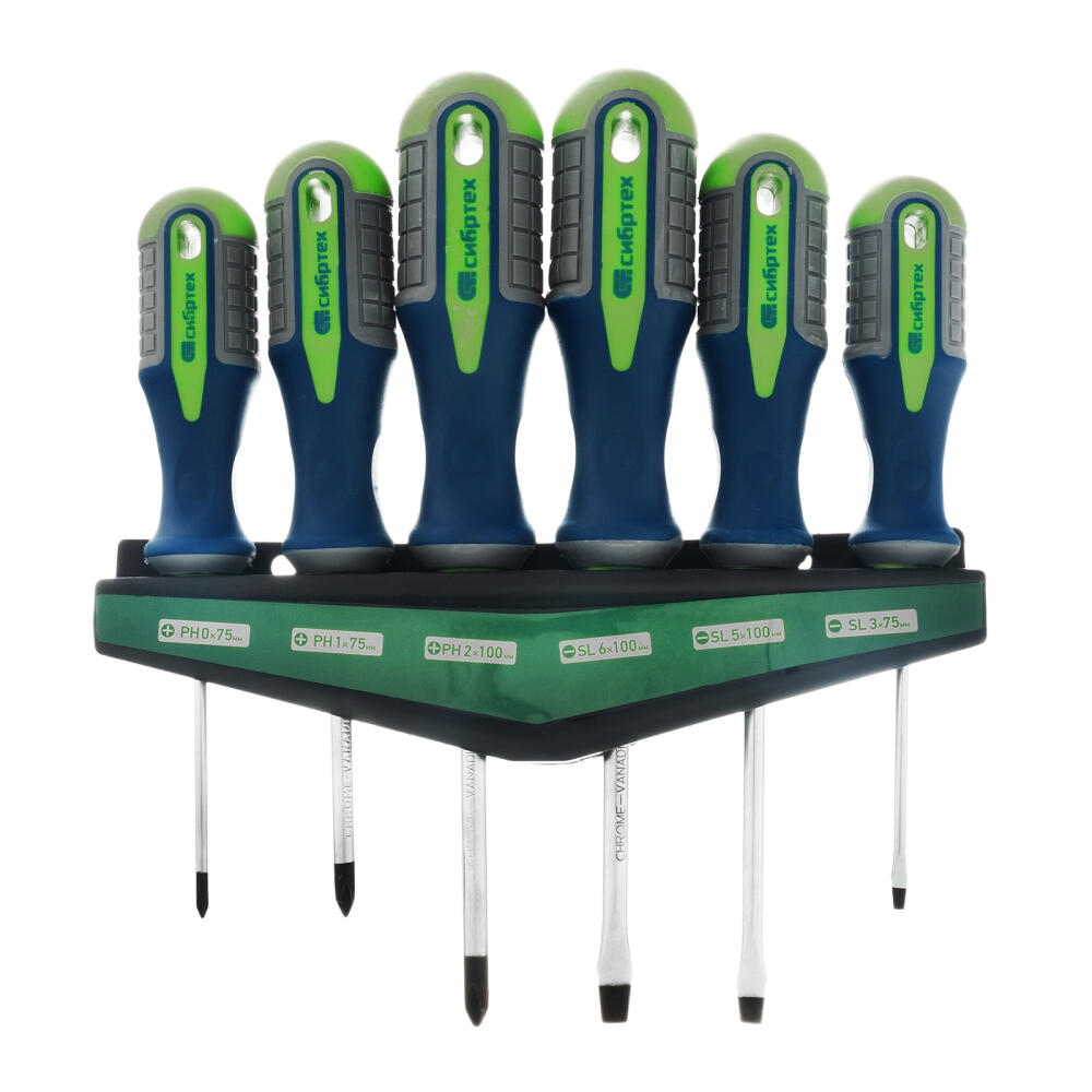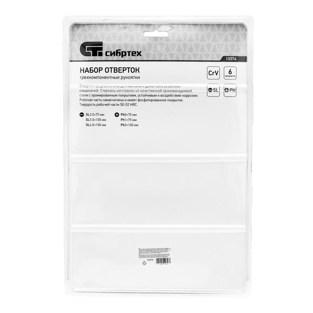 Набор отверток Сибртех 13374 включает в себя 6 предметов из стали CrV с трехкомпонентными рукоятками, которые будут полезны мастерам при осуществлении несложных ремонтных и монтажных работ. С их помощью можно производить монтаж/демонтаж резьбового крепежа с профилем SL и PH. Длина стержней отверток составляет 75-100 мм для удобства работы с крепежом на поверхностях и в небольших углублениях.