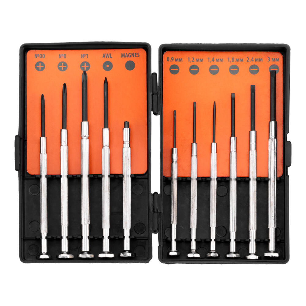 Набор отверток Sparta 133605, 11 предметов, используется для точной механики при осуществлении монтажа/демонтажа микровинтов со шлицами SL и PH. Он рассчитан на несложные бытовые работы, может применяться в частной мастерской. С помощью набора легко ремонтировать мелкие бытовые приборы, очки, часы и т.д.
