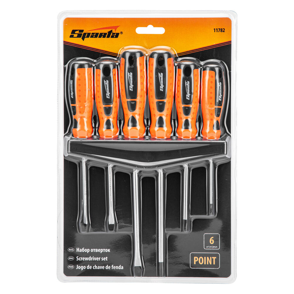 Набор отверток Sparta «Point» 11782 с двухкомпонентными рукоятками, CrV, состоит из 6 инструментов наиболее распространенных типоразмеров. Применяется для закручивания и откручивания крепежных элементов с профилем SL и PH. Набор рассчитан на бытовое использование, осуществление несложных монтажных и ремонтных работ. Отвертками можно работать в труднодоступных местах, т.к. комплект включает инструменты как с коротким — 75 мм, так и с длинным стержнем 150 мм.