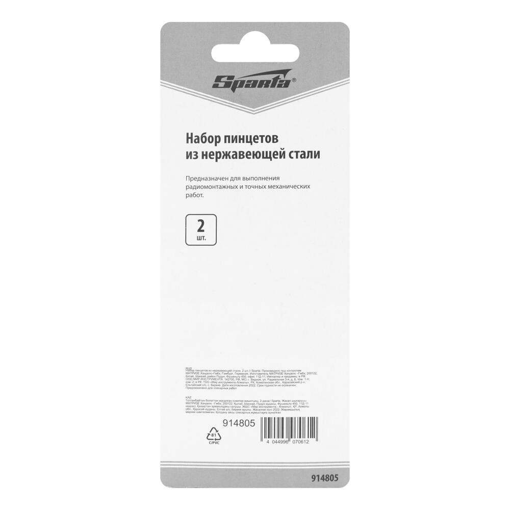 Набор Sparta 914805 включает в себя 2 пинцета для удержания мелких деталей. Инструменты прямой и изогнутой формы пригодятся мастерам, работающим с элементами, которые нельзя или неудобно захватывать руками. Набор оптимален для хенд-мейда, ремонта бытовой техники, часов и т.д.