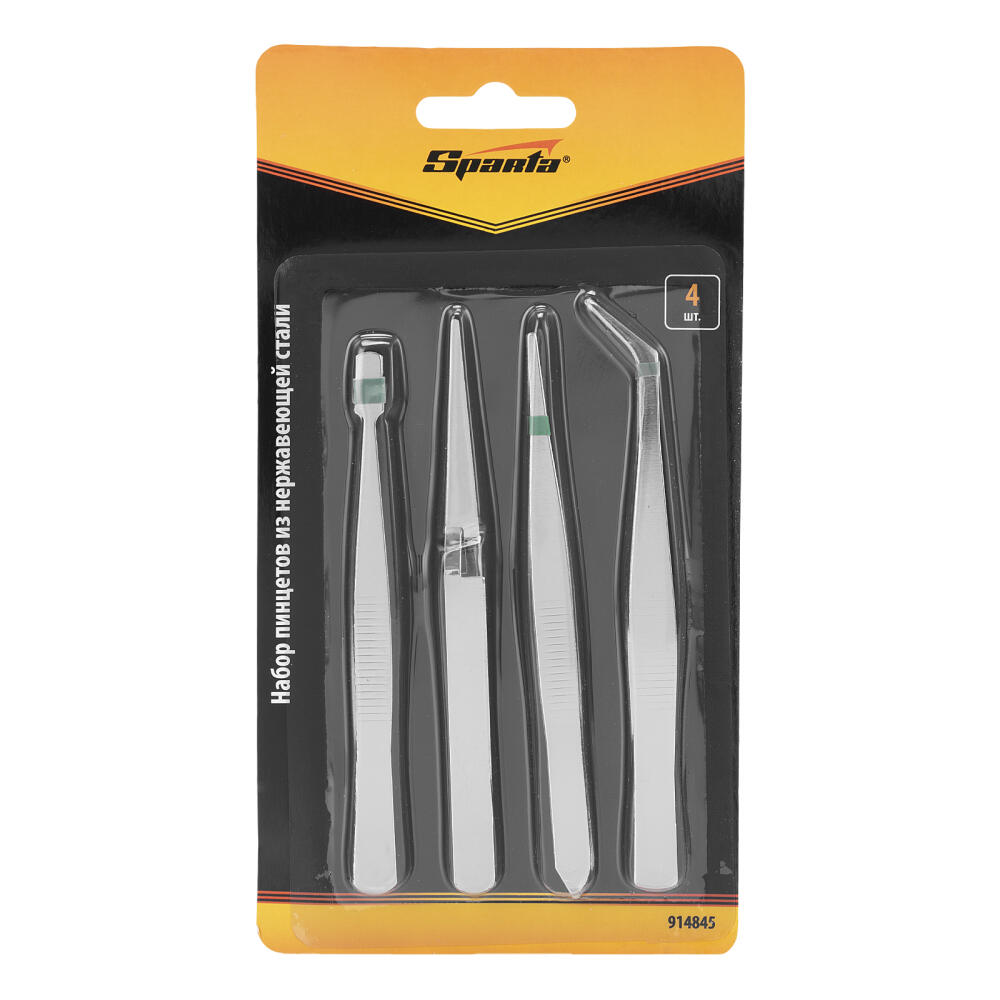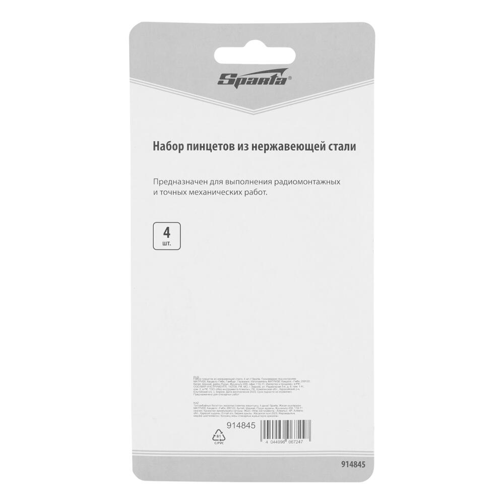 Набор Sparta 914845 включает в себя 4 пинцета для удержания мелких деталей. Инструменты прямой и изогнутой формы пригодятся мастерам, работающим с элементами, которые нельзя или неудобно захватывать руками. Набор оптимален для хенд-мейда, ремонта бытовой техники, часов и т.д.