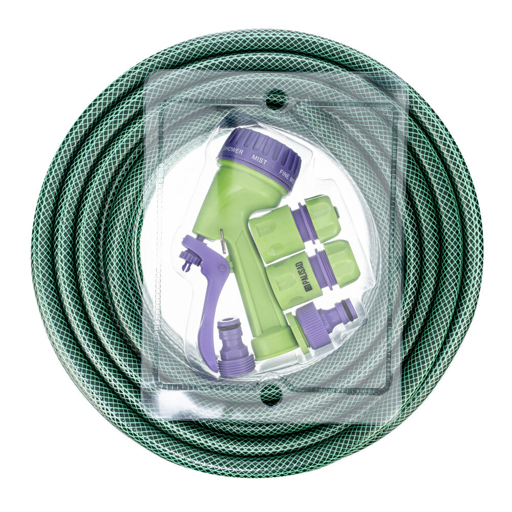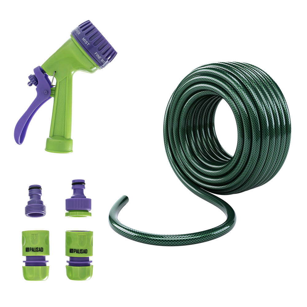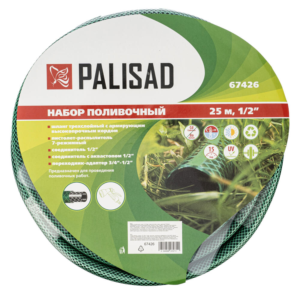 Поливочный набор Palisad 67426 состоит из шланга диаметром 1/2" и длиной 25 м, 7-режимного пистолета, соединителей и адаптера. Подключается к источнику водоснабжения через отвод или кран с внешней резьбой диаметром 1/2" или 3/4". Трехслойный шланг с армирующим слоем отличается повышенной прочностью и выдерживает давление до 10 бар. Он хорошо держит форму, не скручивается и рассчитан на интенсивное использование. Набор полностью готов к работе и будет полезен для ухода за дачным участком, парком или сквером.