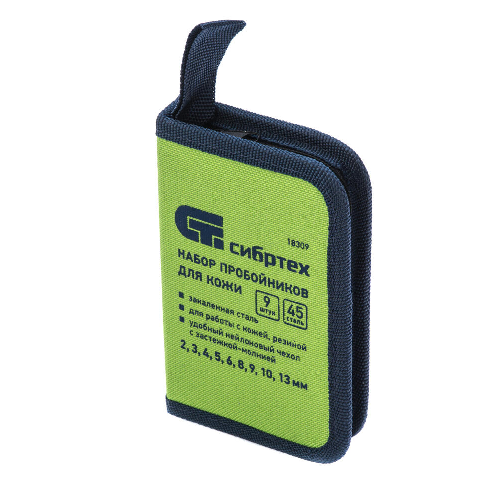 Набор пробойников для кожи Сибртех 18309, 9 шт. в чехле, позволяет пробить отверстия диаметром 2, 3, 4, 5, 6, 8, 9, 10 и 13 мм посредством ударного воздействия от киянки. Инструменты предназначены для работы с плотными материалами: кожей и резиной. Благодаря высокоточной прецизионной заточке режущих кромок пробойники выполняют ровный и качественный рез.