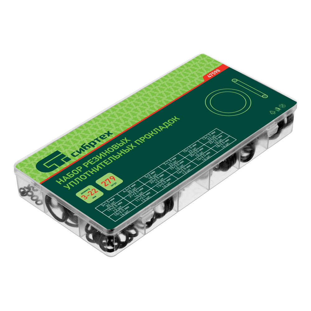 Набор Сибртех 47598 состоит из 279 резиновых уплотнительных прокладок с наружным диаметром от 3 до 23 мм и используется для создания герметичных конструкций. Позволяет решать широкий спектр задач, т. к. включает кольца наиболее часто встречающихся размеров. Прокладки используют для сантехнических и других ремонтных работ, а также в качестве уплотнительных резинок для автомобиля.