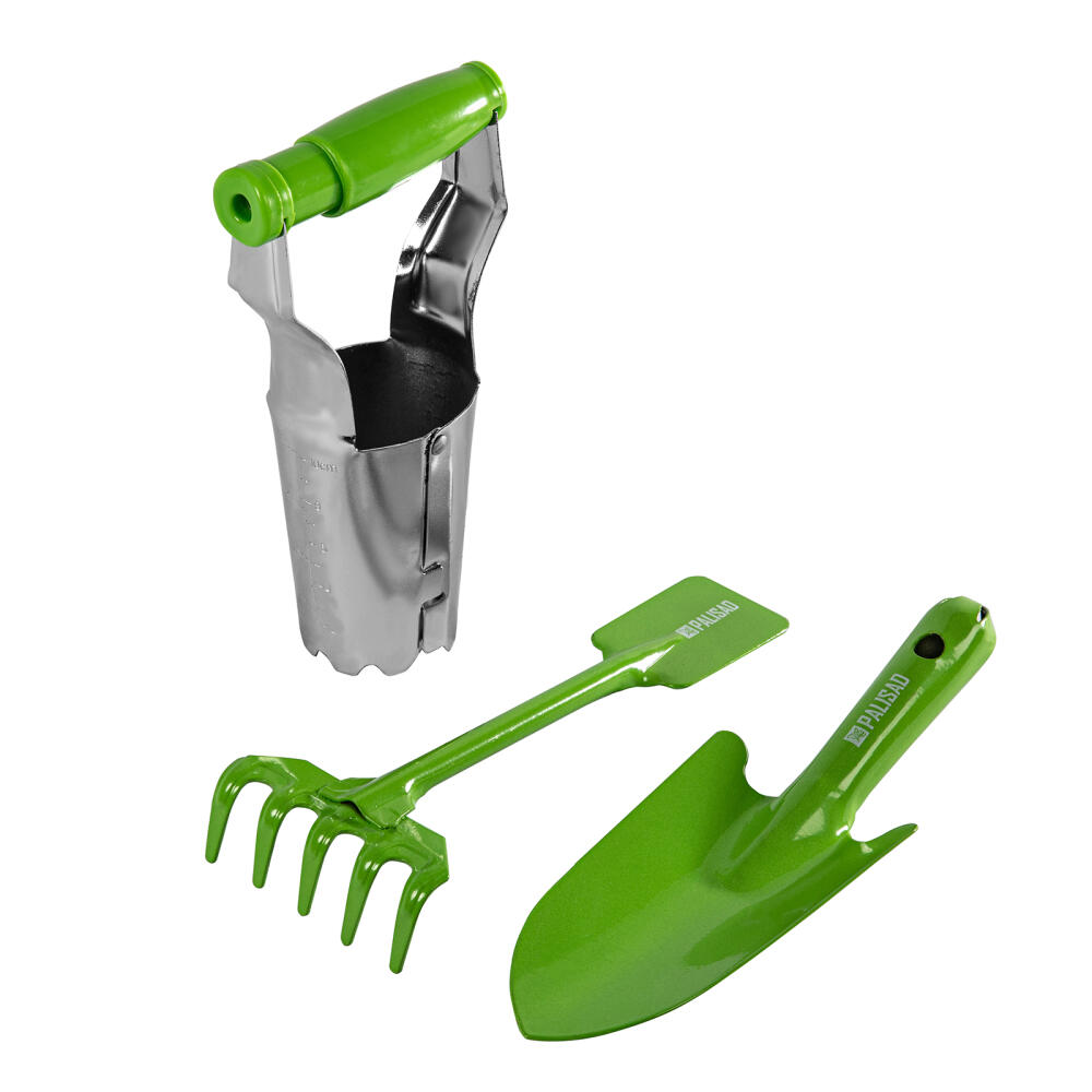 Набор цельнометаллических садовых инструментов Palisad FRESH LINE 64490 состоит из 3 предметов, предназначенных для вскапывания и рыхления почвы, а также формирования лунок для посадки растений. Мерная шкала на корпусе посадочного конуса позволяет создавать лунки определенной глубины. Грабли и совок целиком выполнены из металла, поэтому выдерживают длительное использование. Верхняя часть грабель выполнена в форме лопатки, что расширяет возможности применения инструмента. Набор пригодится для ухода за растительностью на дачном участке.