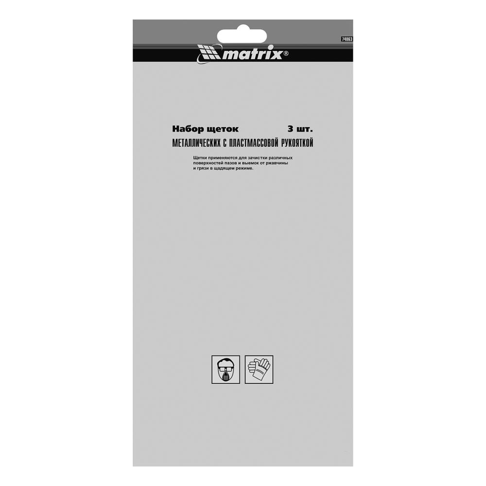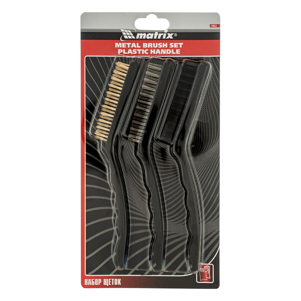 Набор из 3 больших щеток Matrix 74863 с пластмассовыми ручками предназначен для различных видов обработки — стальные удаляют ржавчину, загрязнения и старую краску с металлических и других поверхностей, а нейлоновая браширует и мягко очищает деревянные изделия. Набор пригодится во время ремонта, проведения кузовных работ, а также будет полезен в быту.