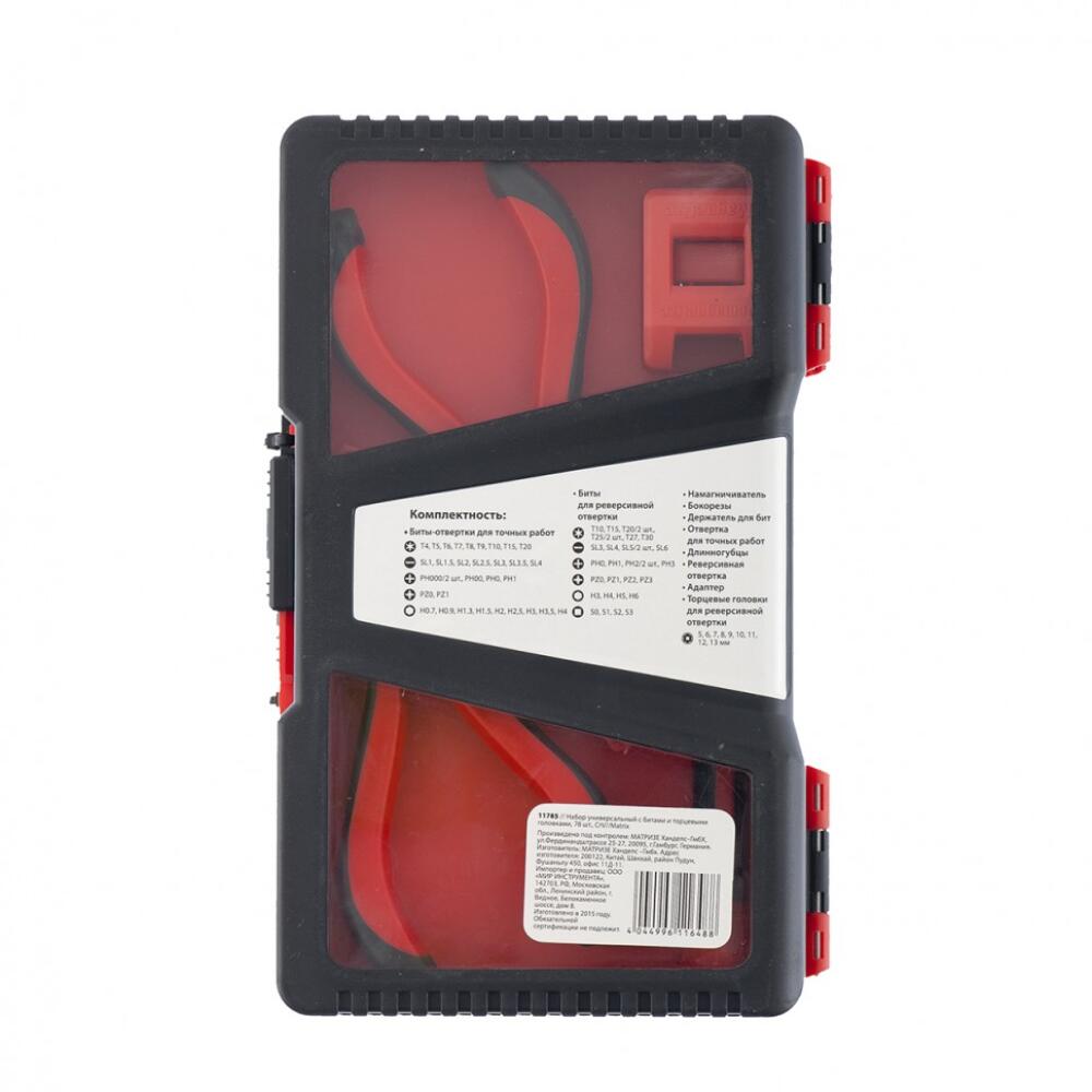 Универсальный набор Matrix 11785 включает в себя 78 предметов из стали CrV: реверсивную отвертку, адаптер, держатель для бит, отвертку для точных работ, бокорезы, длинногубцы, намагничиватель, биты и торцевые головки. Инструменты предназначены для монтажа и демонтажа резьбовых соединений, а также решения других задач.