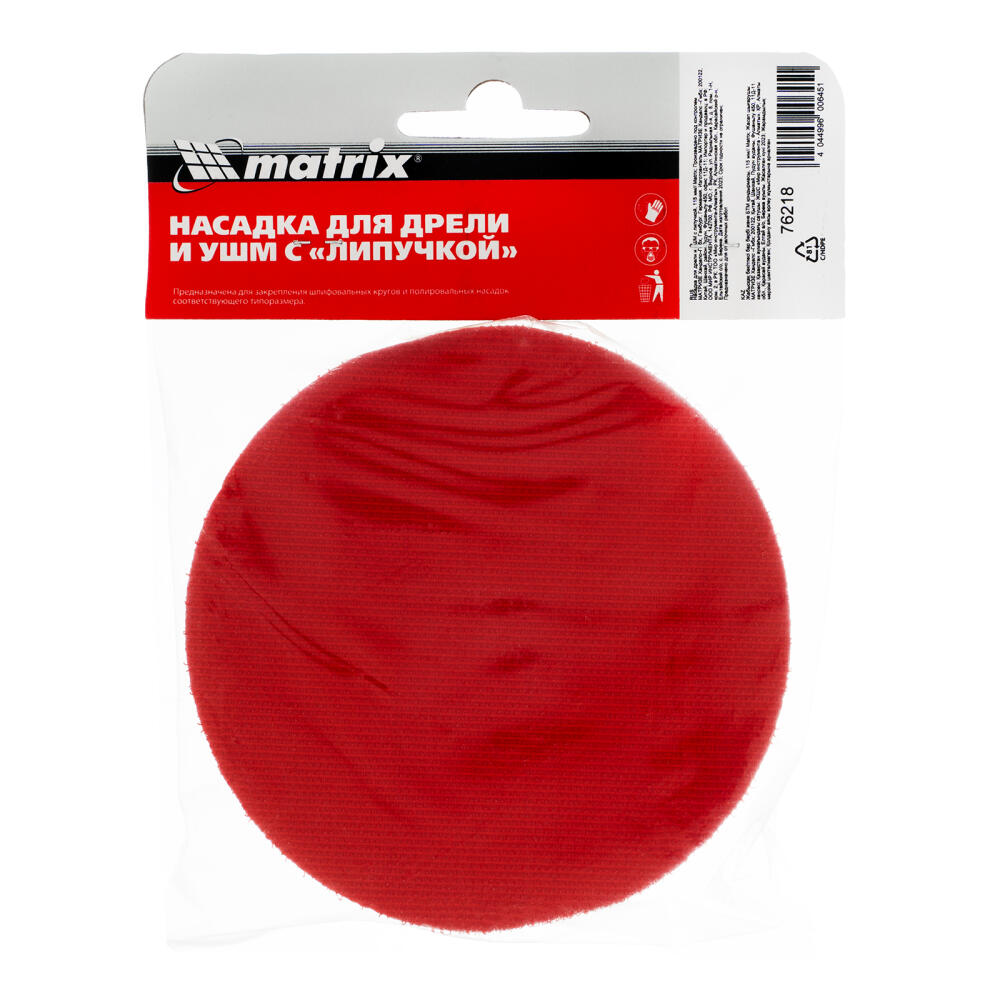 Насадка для дрели и УШМ с липучкой Matrix 76218 используется с дрелями и углошлифовальными машинами, поддерживающими оснастки диаметром 115 мм и имеющими рабочий диапазон вращения до 12500 об/мин. Предназначена для установки абразивных и полировальных кругов на ворсовой подложке. Насадка с демпферной вставкой из вспененного этиленвинилацетата (EVA) универсальна и подходит для всех видов полировальных и шлифовальных работ.