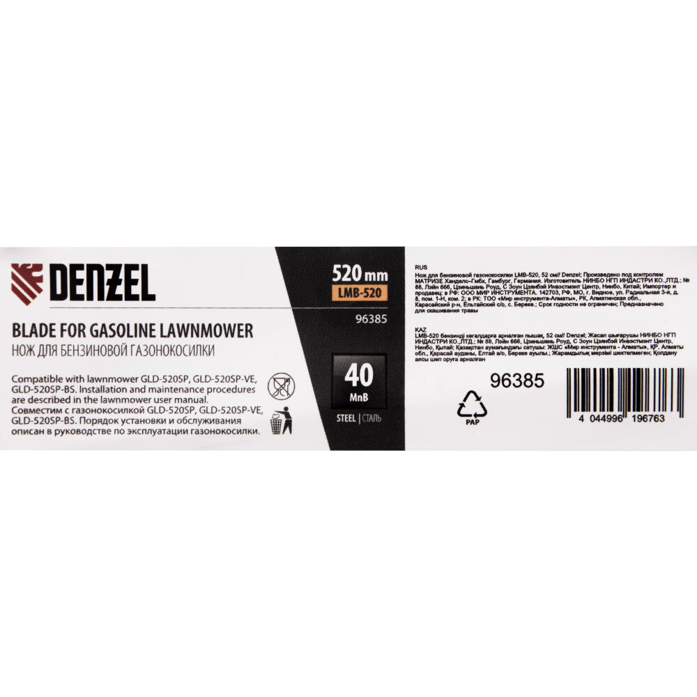 Нож Denzel 96385 длиной 52 см — сменный режущий элемент для бензиновых газонокосилок GLD-520SP, GLD-520SP-BS и GLD-520SP-VE. Используется для скашивания травы на дачных газонах, кортах, а также для ухода за садовыми и парковыми территориями. Эффективно срезает траву, пригодится владельцам дачных участков и работникам коммунальных служб.