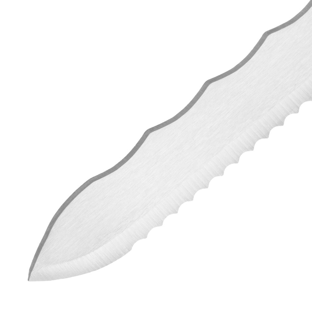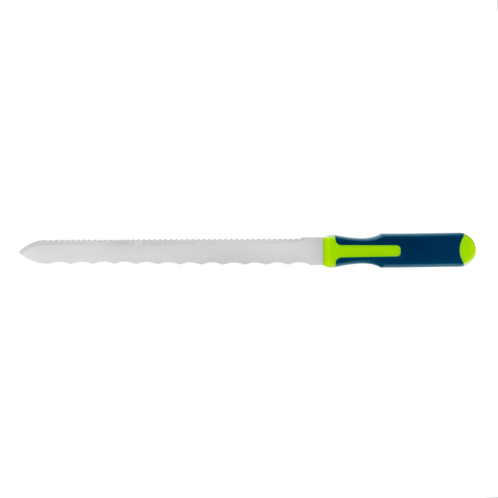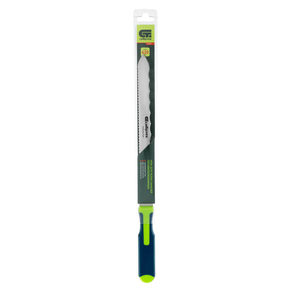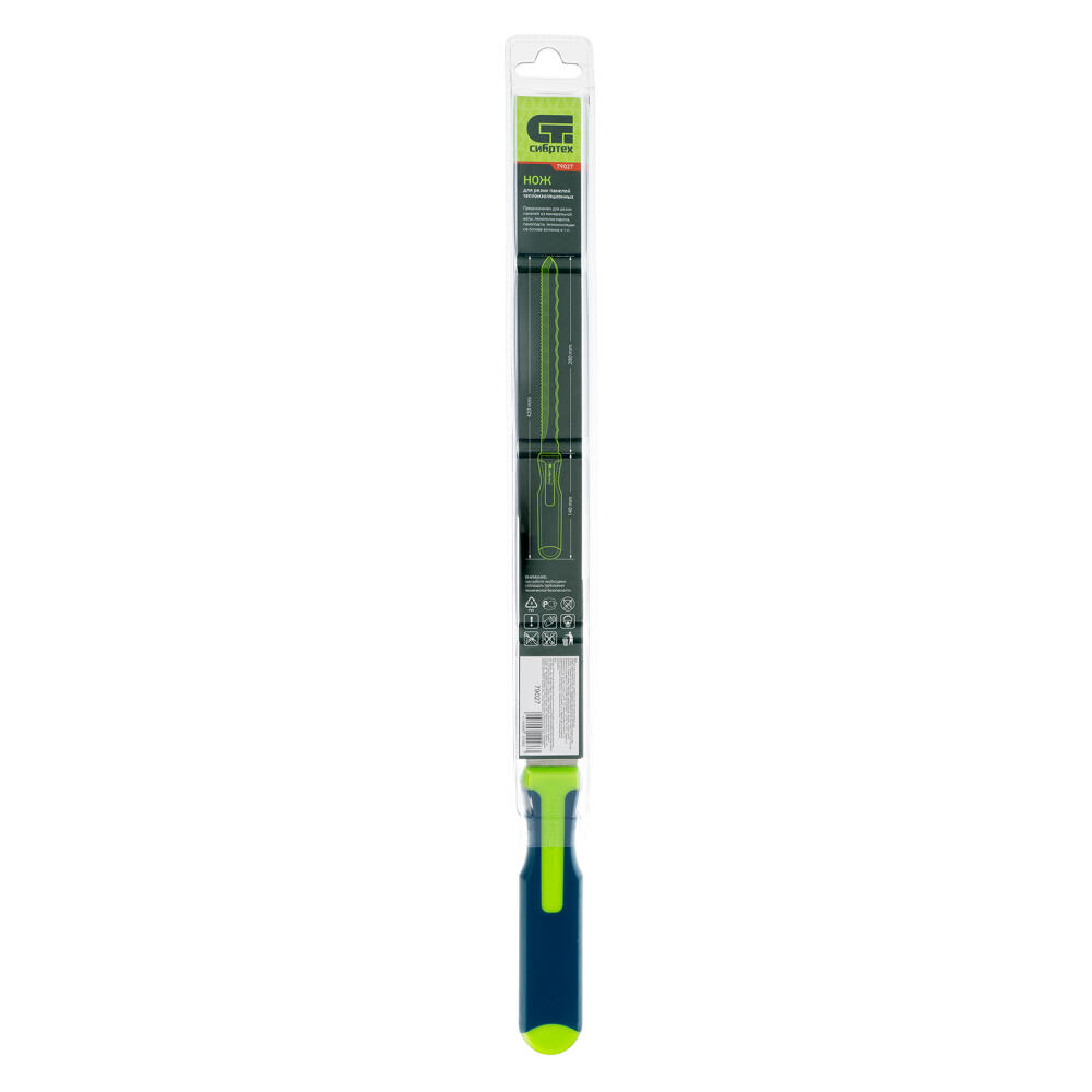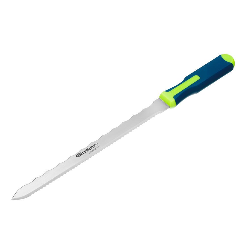 Нож Сибртех 79027 общей длиной 420 мм, с обрезиненной рукояткой и 2-сторонним лезвием длиной 280 мм, используется для резки теплоизоляционных панелей. Полотно имеет две режущих кромки, что позволяет выбрать оптимальную сторону в зависимости от типа материала. А благодаря длине 280 мм лезвие легко справляется с подрезкой длинных и толстых панелей.
