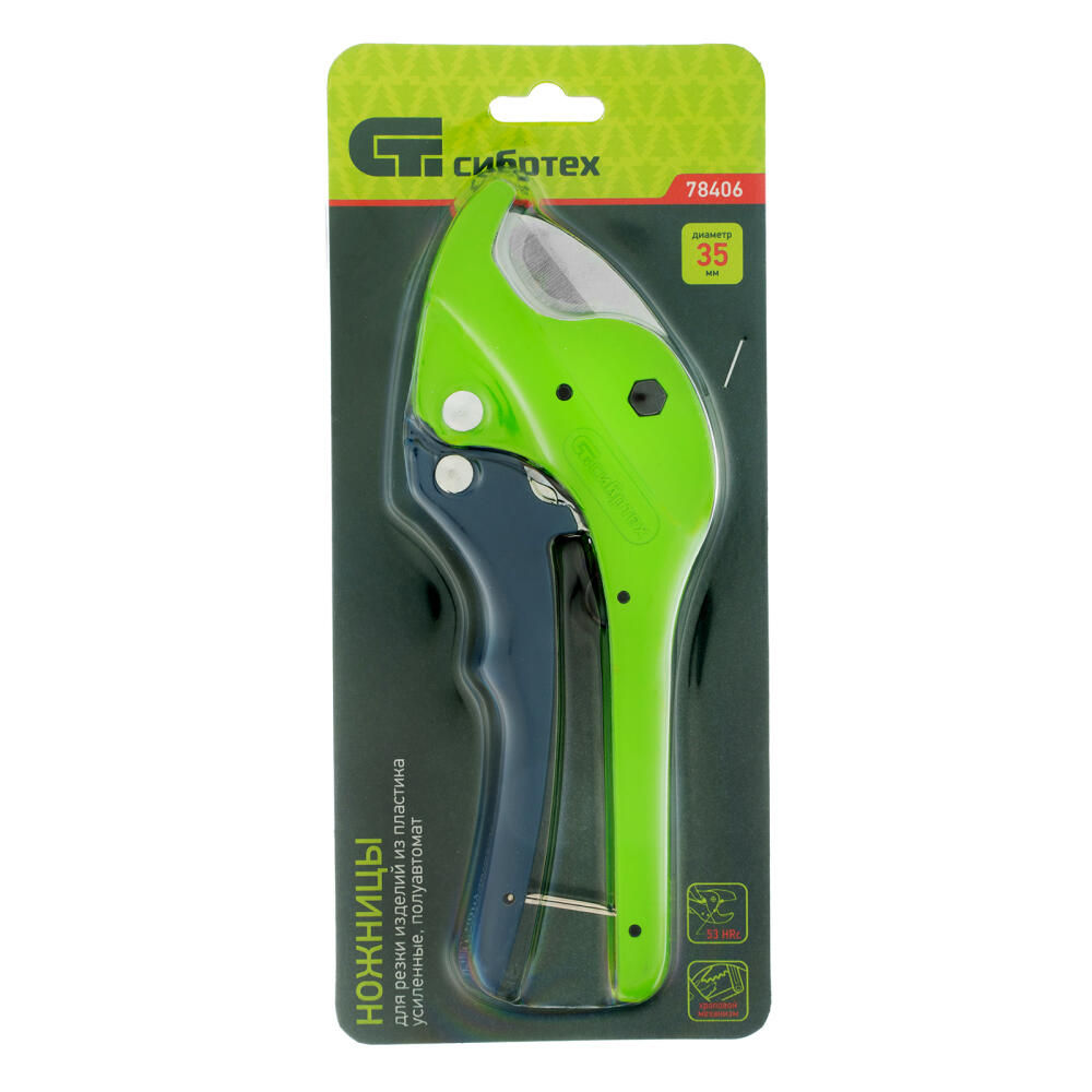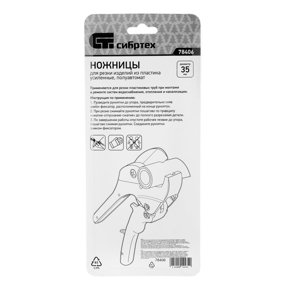 Усиленные полуавтоматические ножницы Сибртех 78406 применяются для резки изделий из пластика диаметром до 35 мм. Полуавтоматический рычажный механизм облегчает работу. Ножницы бытового назначения пригодятся для обслуживания трубопроводных систем дома и на даче.