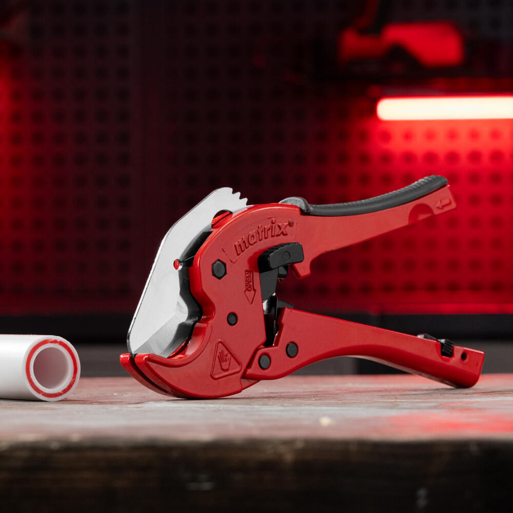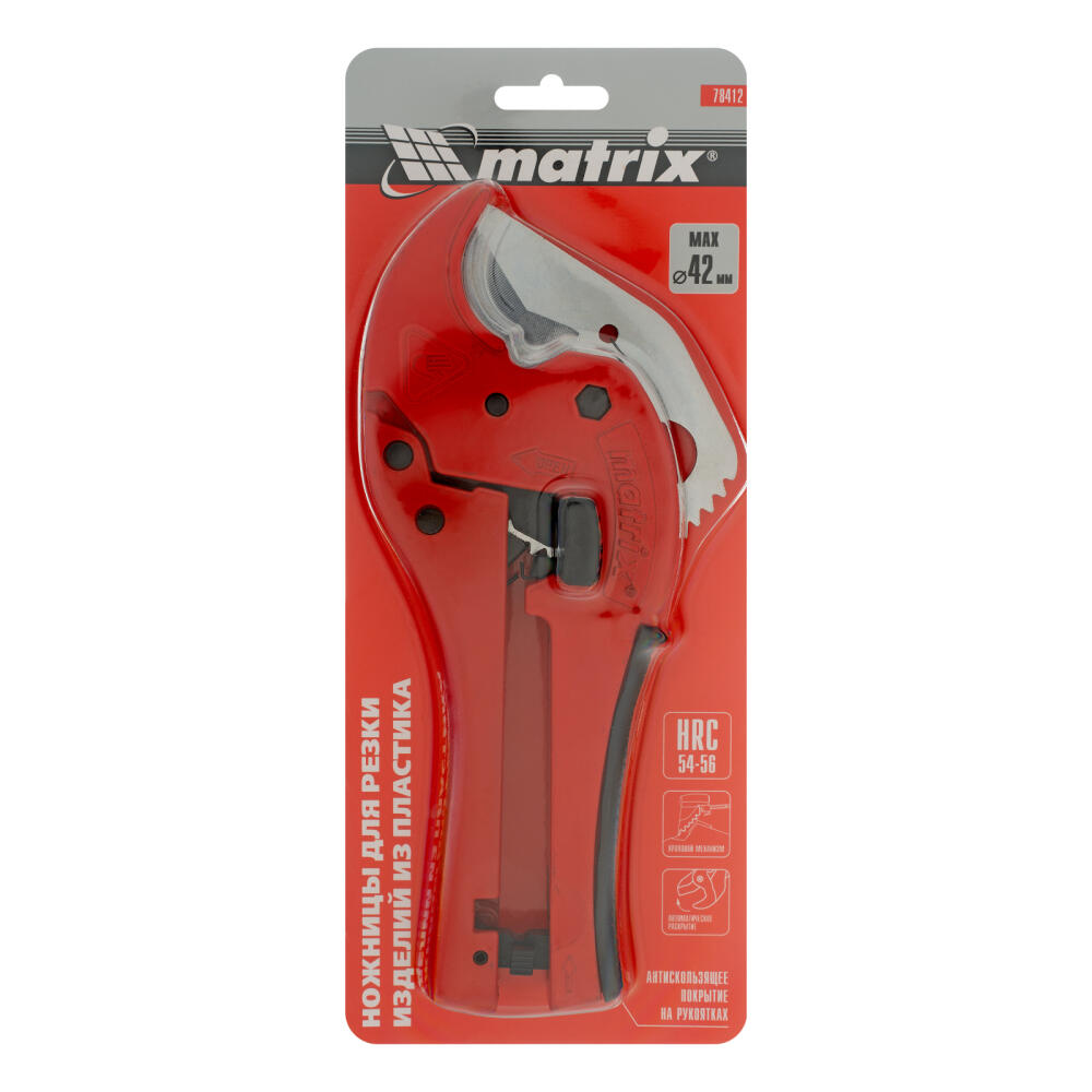 Ножницы Matrix 78412 с обрезиненной опорной рукояткой и порошковым покрытием рукояток используются для резки резиновых шлангов и изделий из ПВХ диаметром и шириной до 42 мм — труб, галтелей, плинтусов, профилей и других предметов. Трапециевидное полотно с двумя рабочими кромками облегчает выполнение работ. Ножницы пригодятся сантехникам и мастерам по отделке помещений.