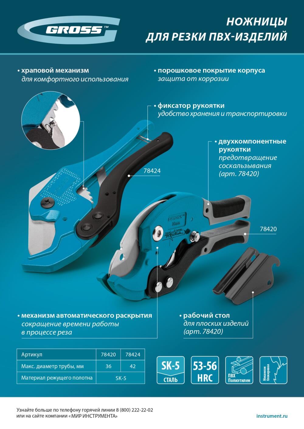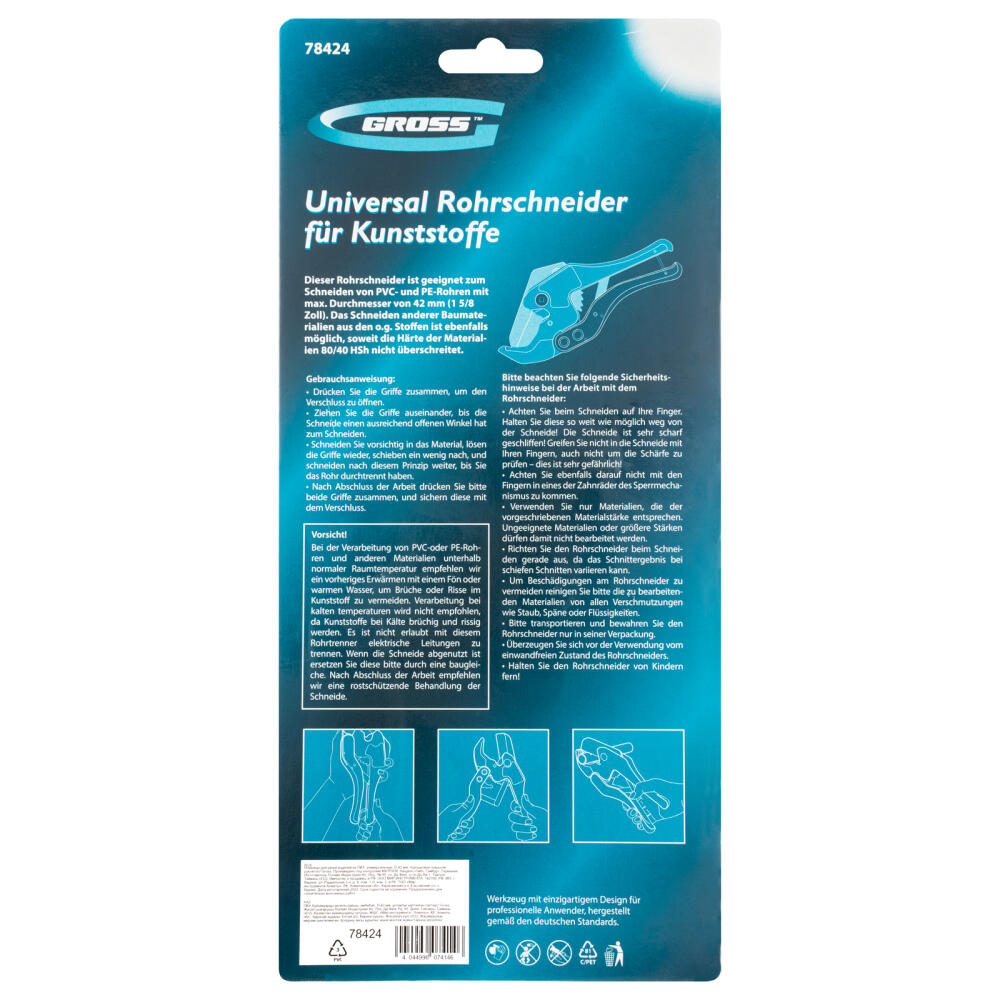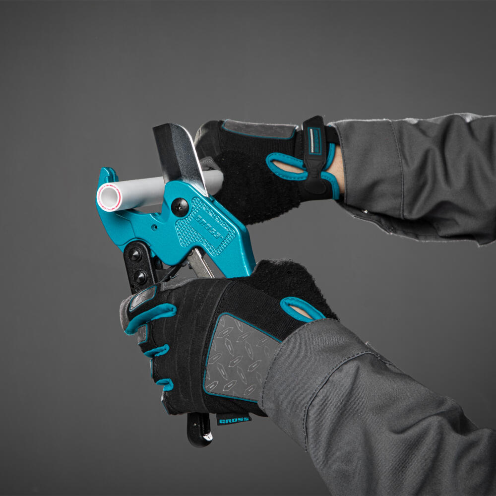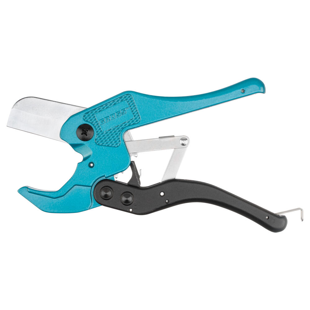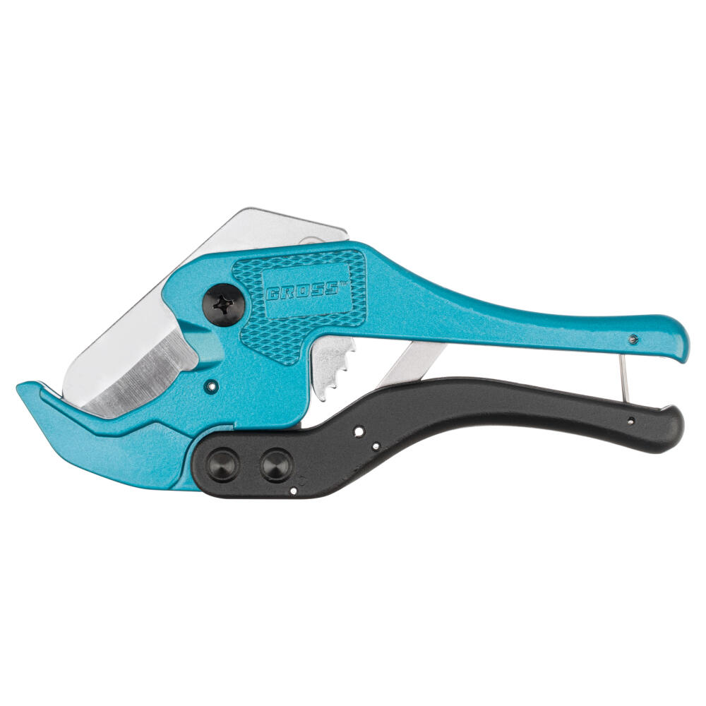 Универсальные ножницы для резки изделий из ПВХ Gross 78424 с порошковым покрытием рукояток применяются для разрезания пластиковых труб диаметром до 42 мм, а также профилей, плинтусов, галтелей, реек, планок, резиновых шлангов и других предметов. Благодаря прямому ножу инструмент может резать плоские заготовки. Ножницы пригодятся для выполнения сантехнических и отделочных работ.