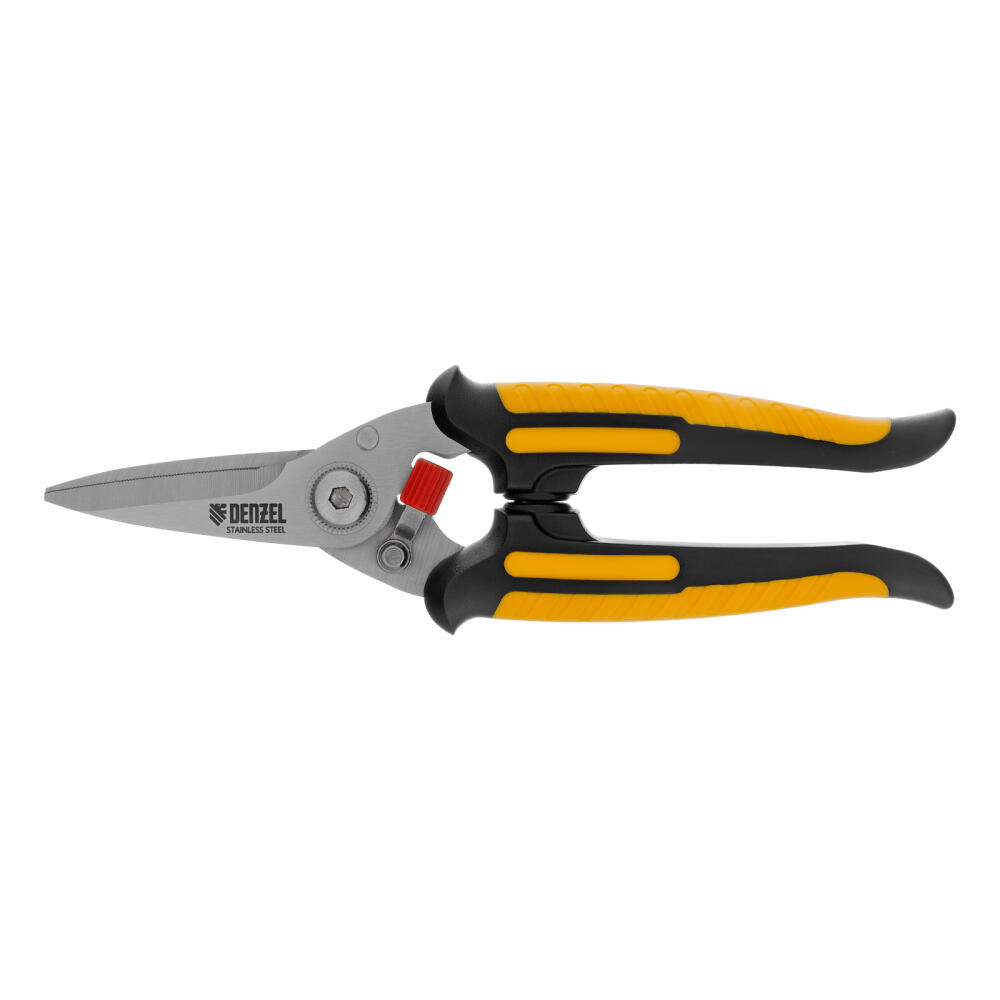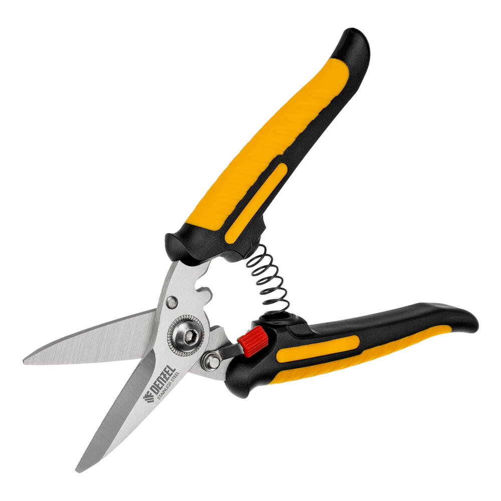Универсальные ножницы Denzel 78318 длиной 185 мм — инструмент для разрезания тонкого металла и мягких материалов. Одно из лезвий имеет серрейторную (зубчатую) заточку, поэтому разрезаемый материал не выскальзывает из инструмента. Ножницы подходят для выполнения разнообразных работ: на даче помогут разрезать стальную сетку с небольшим диаметром проволоки, в походе — ветки или рыбу, во время мелкого ремонта или занятий творчеством — провода, кожу, резину, картон, бумажную лозу и другие материалы.