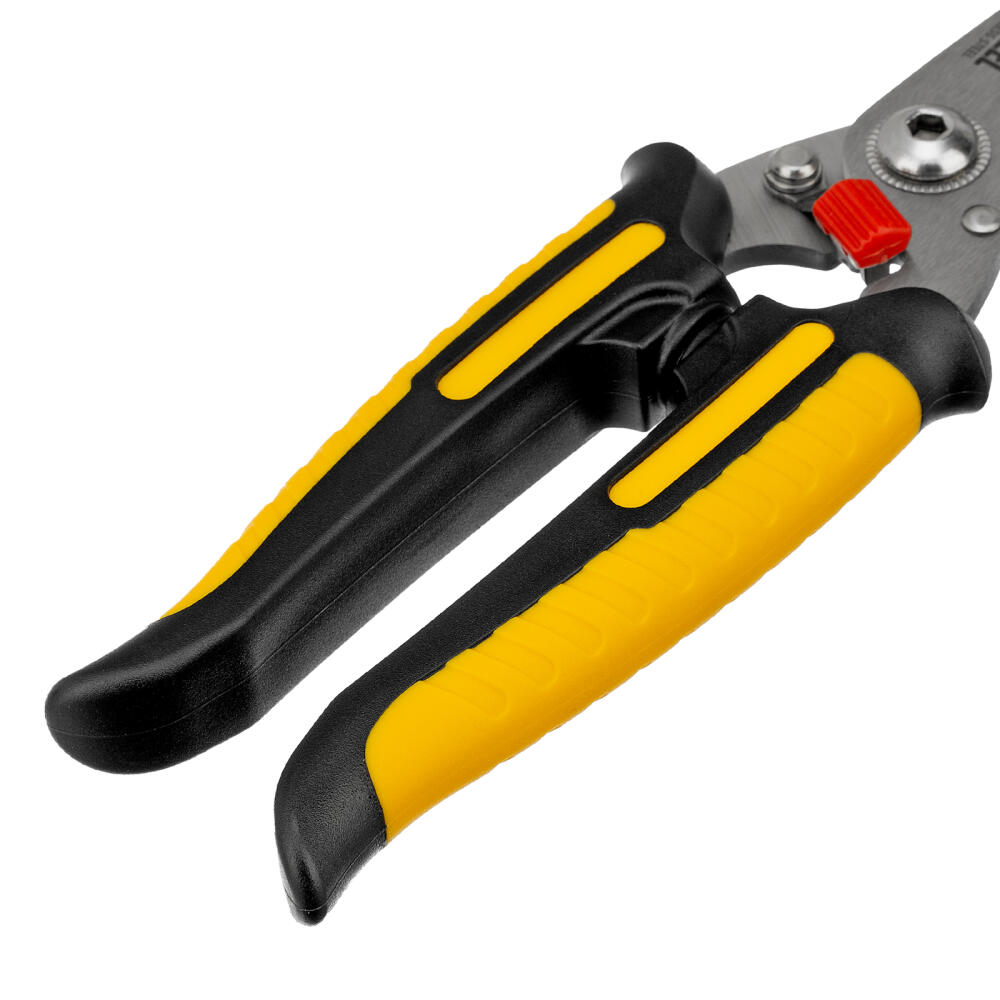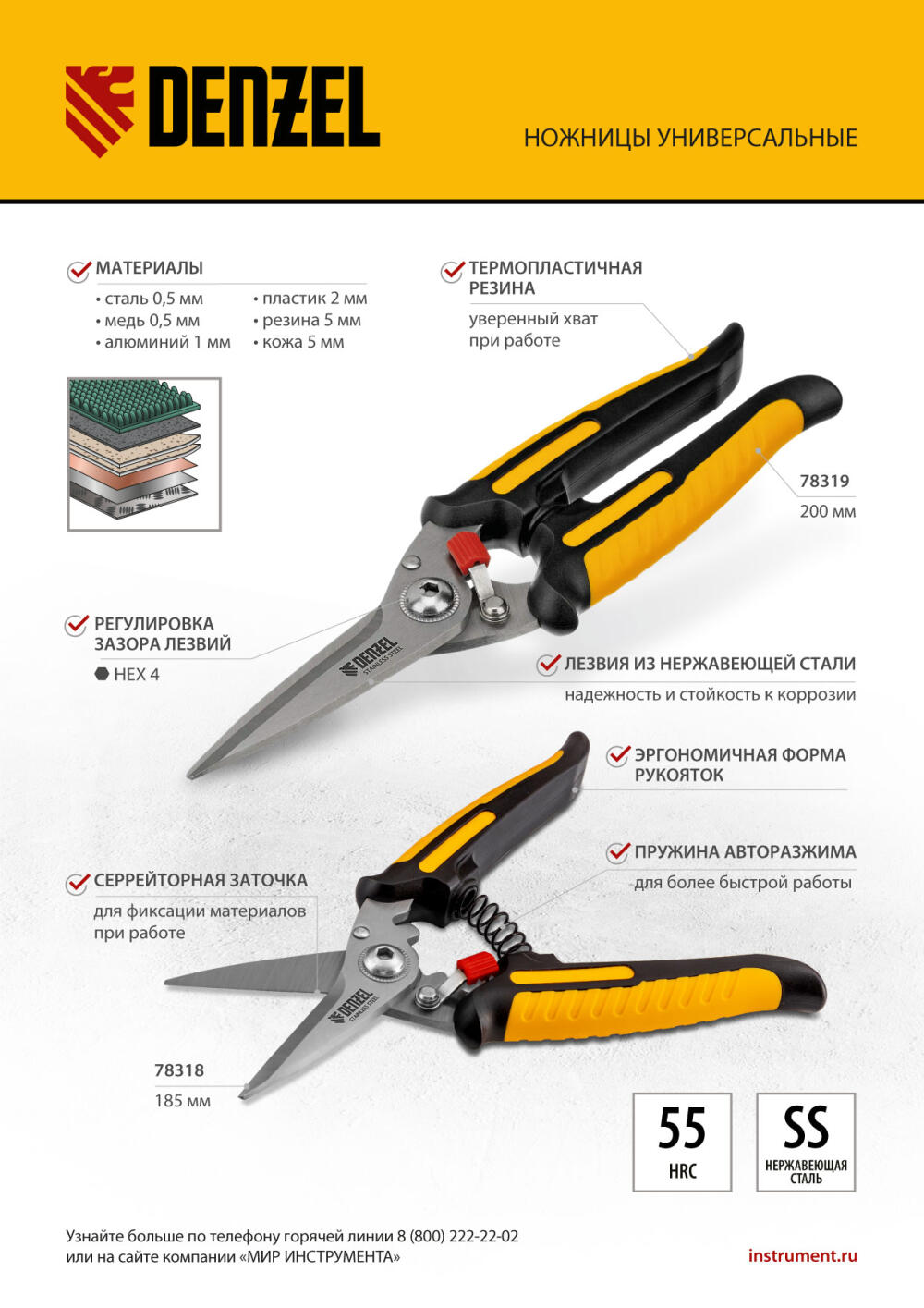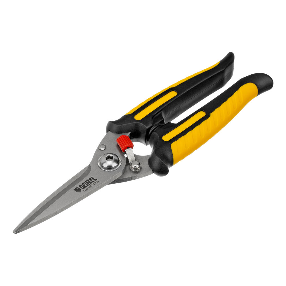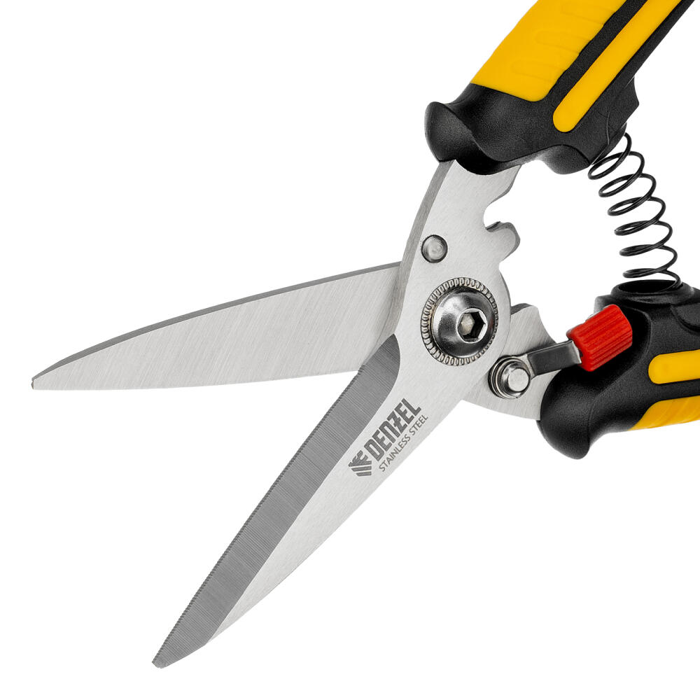 Универсальные ножницы Denzel 78319 длиной 200 мм — инструмент для разрезания тонкого металла и мягких материалов. Одно из лезвий имеет серрейторную (зубчатую) заточку, поэтому разрезаемый материал не выскальзывает из инструмента. Ножницы подходят для выполнения разнообразных работ: на даче помогут разрезать стальную сетку с небольшим диаметром проволоки, в походе — ветки или рыбу, во время мелкого ремонта или занятий творчеством — провода, кожу, резину, картон, бумажную лозу и другие материалы.