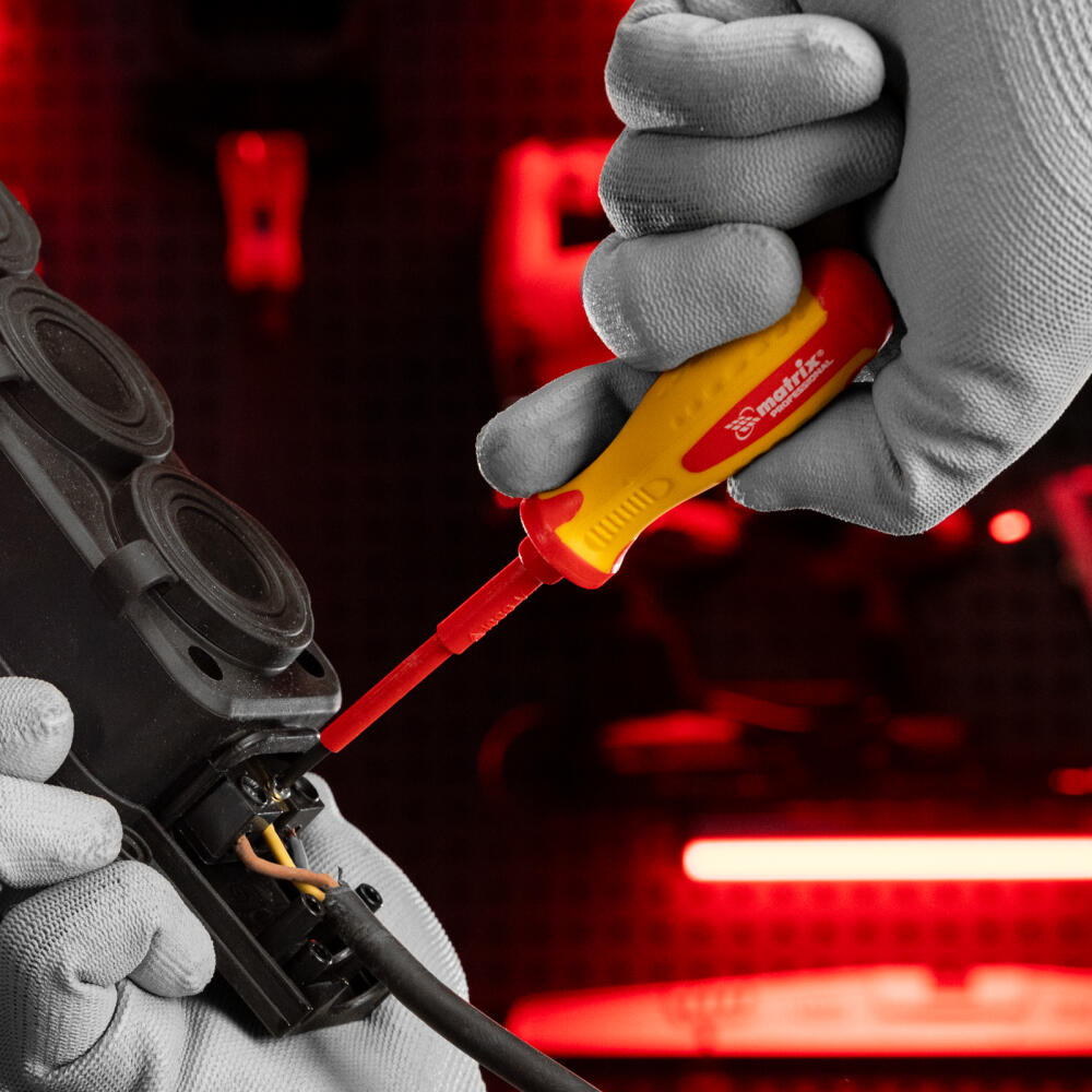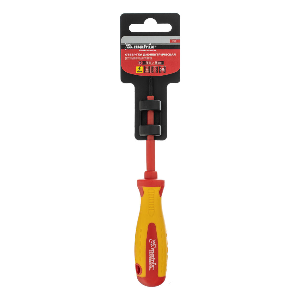 Отвертка Matrix Insulated 12924, PH0 x 75 мм, из стали CrMo, до 1000 В, с двухкомпонентной рукояткой, рассчитана на работу с крепежом типа Phillips «крест». Она пригодится профессиональным мастерам при осуществлении ремонтных работ и обслуживании электрооборудования. Стержень длиной 75 мм оптимален для монтажа/демонтажа легкодоступного крепежа и крепежа, расположенного в углублениях. Важно — рукоятка имеет диэлектрическое покрытие до 1000 В, однако техника безопасности запрещает работать под напряжением!