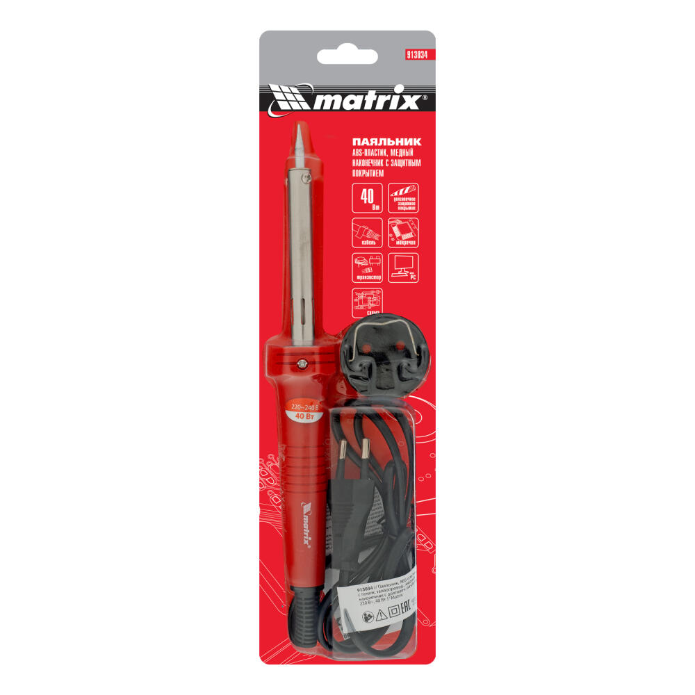 Паяльник Matrix 913034 мощностью 40 W работает от сети 220 В, изготовлен из ABS-пластика с пониженной теплопроводностью и имеет медный наконечник с долговечным покрытием. Используется для пайки транзисторов, микрочипов, электросхем и проводов. В качестве нагревательного элемента использована нихромовая спираль, что снижает риск поломки в случае падения или удара. Конусовидное жало оптимально для проведения точной пайки. Гальваническое покрытие защищает наконечник от внешних воздействий, что продлевает срок службы инструмента. Паяльник пригодится радиолюбителям и домашним мастерам.