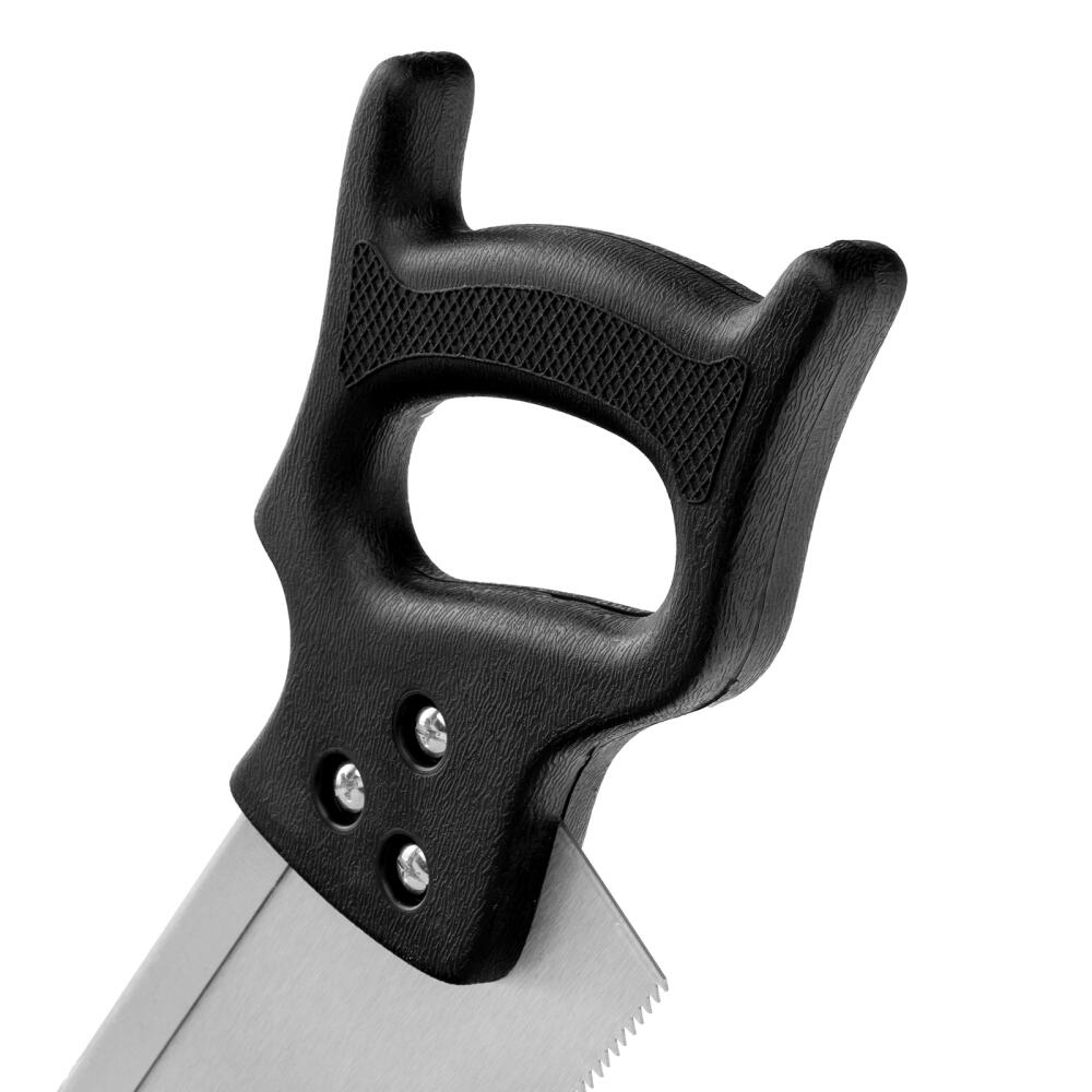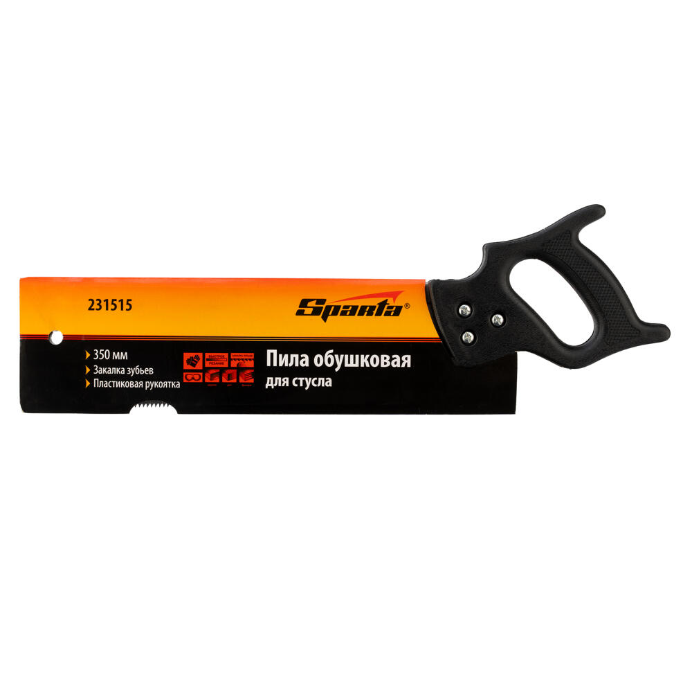 Обушковая пила для стусла Sparta 231515 с полотном длиной 350 мм используется для распиливания под углом заготовок из древесины, фанеры или ДСП. Пилить можно вдоль или поперек волокон. В верхней части полотна имеется ребро жесткости, которое не дает ему сгибаться. Шаг зубьев составляет 7-8 TPI, что обеспечивает быстрый рез. Допускается переточка режущей кромки. Инструмент применяется во время выполнения столярных работ.