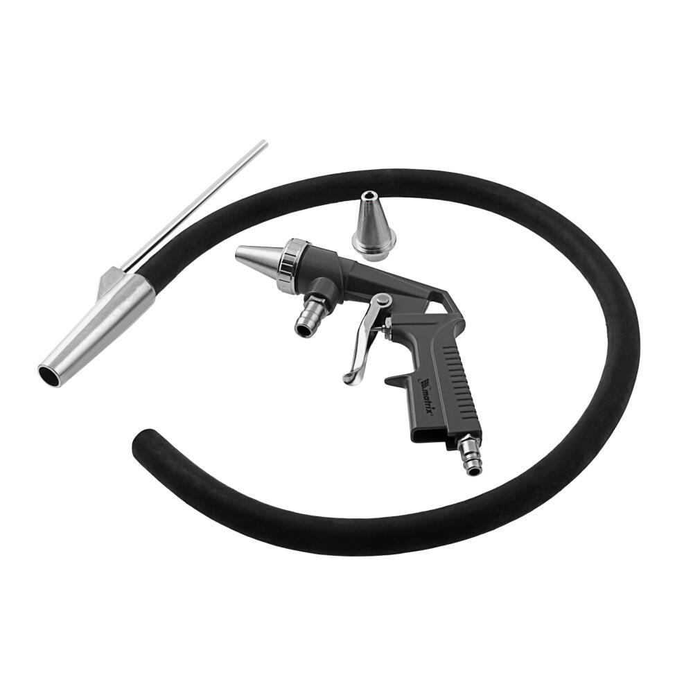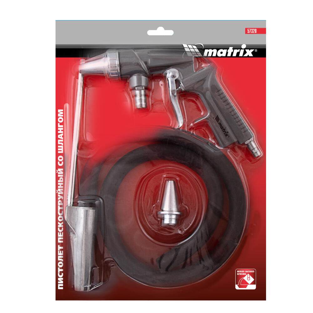 Пневматический пескоструйный пистолет Matrix 57328 со шлангом для забора абразива помогает очистить металлические поверхности от окалины, грязи, налета ржавчины, также используется для шлифовки и декорирования. Воздушно-песчаная смесь подается под давлением 4 бар через сопло диаметром 6 мм, расход воздуха составляет 600 л/мин. Инструмент пригодится при проведении строительных и ремонтных работ, будет полезен в автомастерской.
