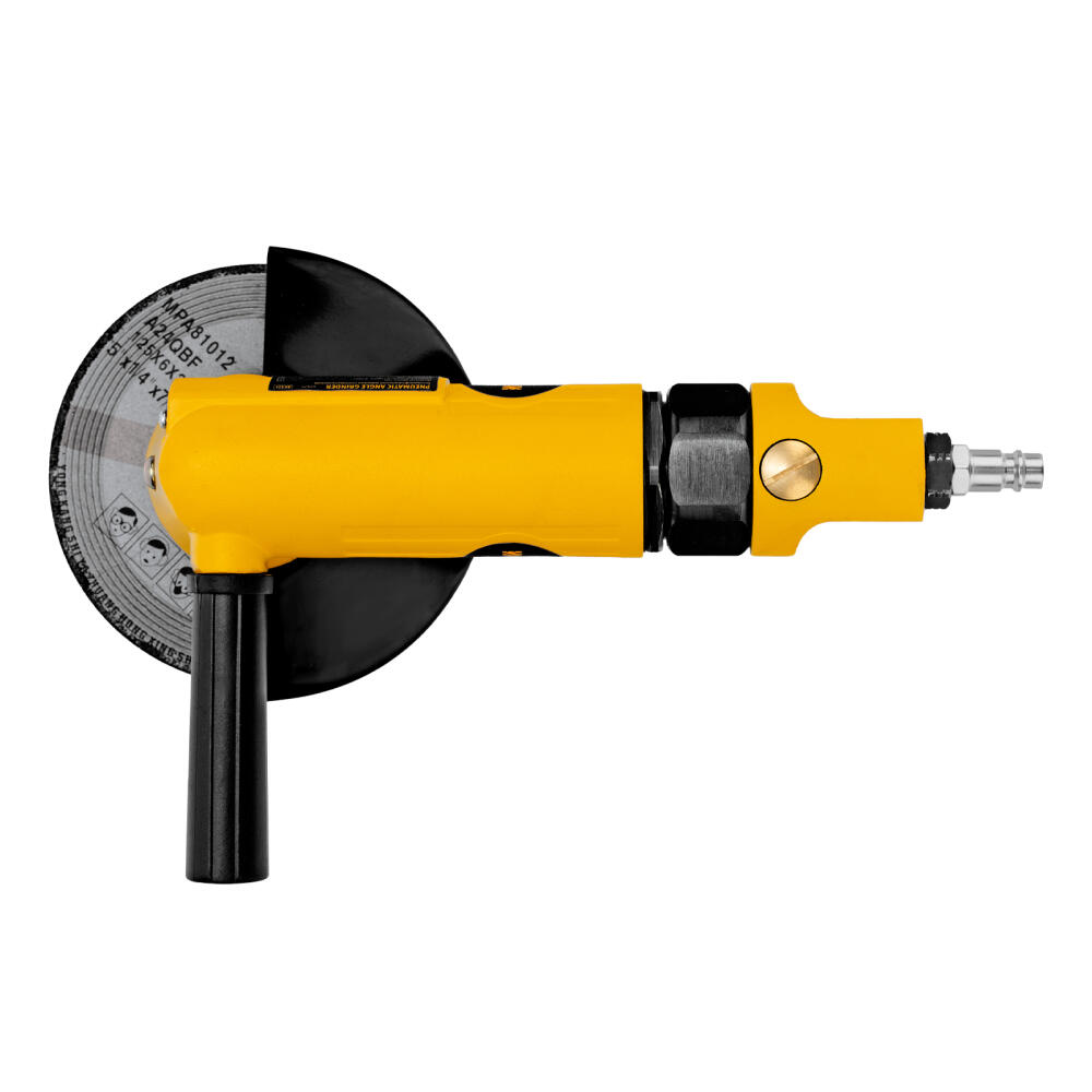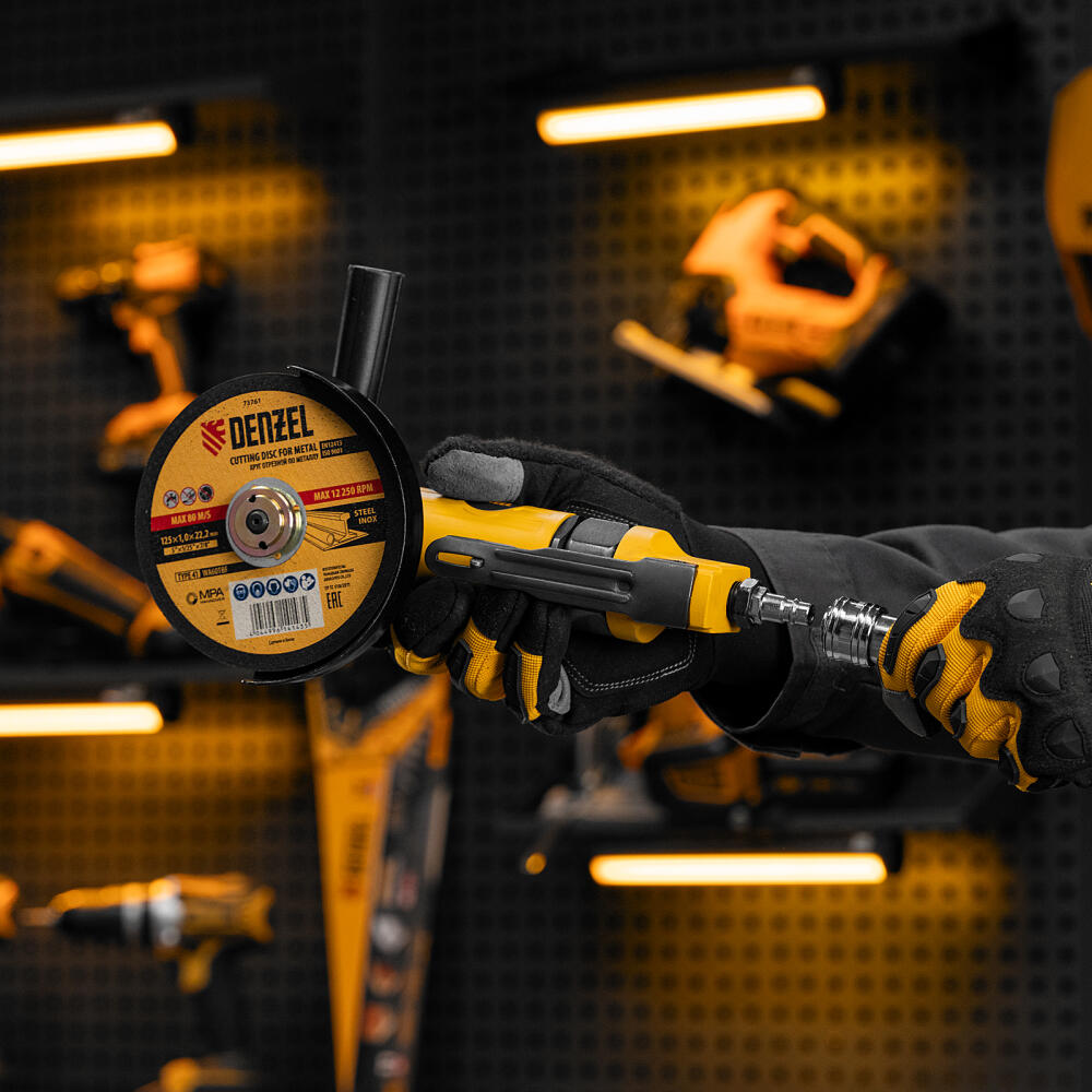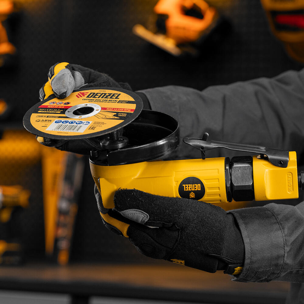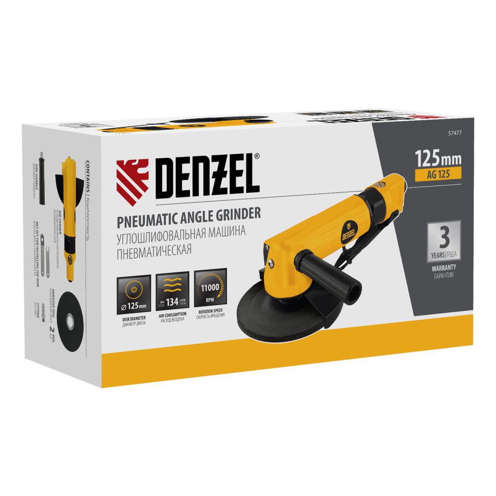 Пневматическая углошлифовальная машина Denzel AG125 57477 используется с дисками до 125 мм для шлифования, зачистки, резки деревянных, металлических, пластмассовых и других материалов. Это универсальный инструмент, востребованный в строительстве, ремонте, незаменимый для домашних мастерских и решения бытовых задач. Частота вращения диска 11000 об/мин при среднем расходе воздуха 186 л/мин обеспечивает высокую производительность и скорость работы. Оптимальная скорость редуктора позволяет быстро и качественно обрабатывать поверхности.,УШМ предназначена для работы при давлении 6,3 бар, расход воздуха в среднем не превышает 200 л/мин. Во время работы не забывайте использовать специальное масло ISO 46, которое можно добавлять как напрямую в инструмент, так и с помощью блока подготовки воздуха Denzel 57469, включающего в себя лубрикатор для автоматической подачи масла.