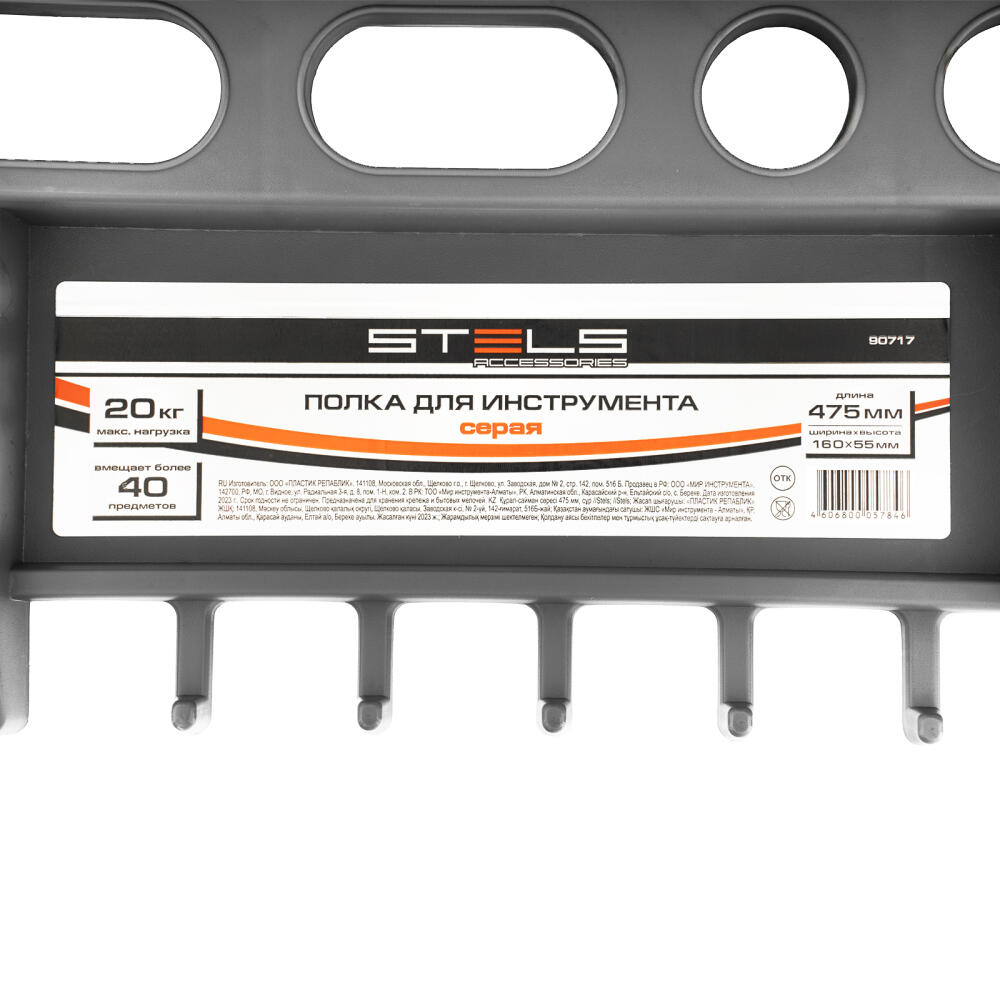 Серая полка Stels 90717 длиной 475 мм используется для хранения инструментов. Благодаря ей все необходимое находится под рукой, а на рабочем месте царит порядок. Полка настенного типа позволяет компактно хранить инструменты в подвешенном виде.