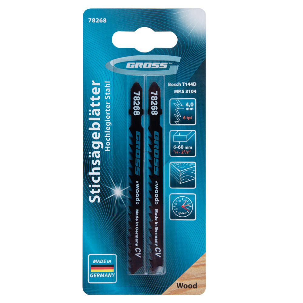 Полотна для электролобзика по дереву Gross 78268, 2 шт. (3104 - T144D), используются для работы с древесиной мягких и твердых пород, ДСП, ДВП и композитных материалов на основе древесины. Они рассчитаны на профессиональное применение, пригодятся при проведении строительных и ремонтных работ. За счет рабочей длины 75 мм и толщины 1,25 мм полотна способны распилить заготовки толщиной 6-60 мм.