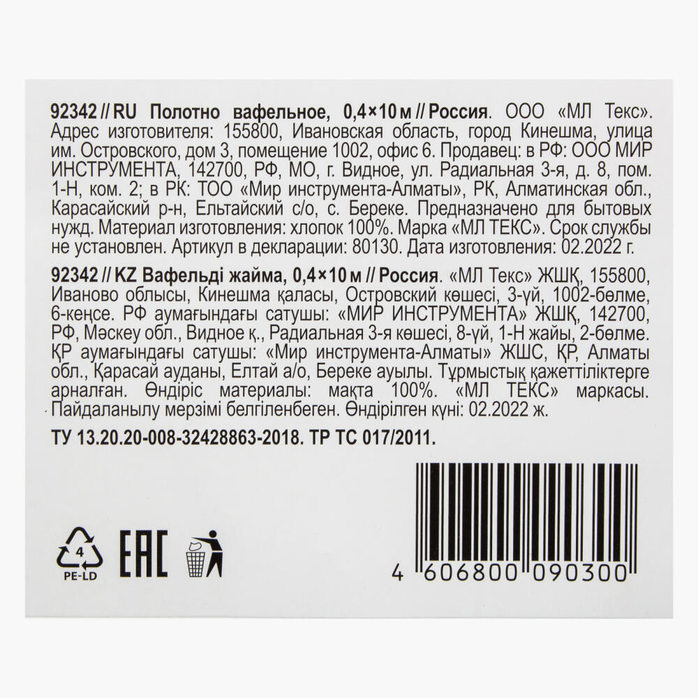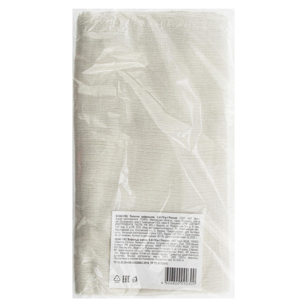 Вафельное полотно 92342 размером 0,4 х 10 м хорошо впитывает влагу и эффективно удаляет загрязнения. Может использоваться во время строительно-монтажных работ, выполнения ремонта различных механизмов, изготовления стекол и зеркал, обтирания оргтехники, автомобильных деталей и поверхностей автотранспортных средств. Пригодится в клининговых компаниях для уборки помещений, а также в медицинской индустрии, общественных учреждениях и сфере общепита.