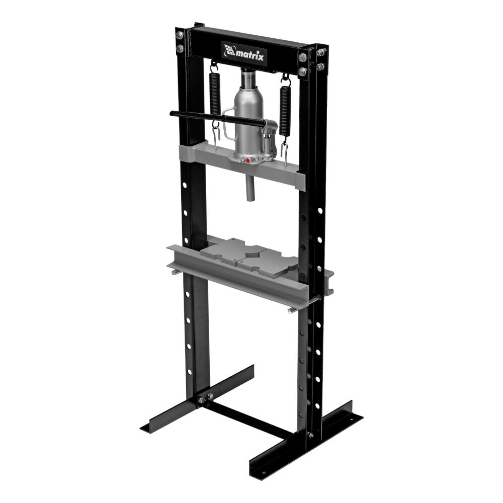 Гидравлический пресс Matrix 523105 размером 1360 х 500 х 510 мм, воздействующий на детали с усилием 12 т, поставляется комплектом из 2 частей. Используется для запрессовки и выпрессовки различных деталей, необходимых для ремонта автомобилей. Изготовлен из толстого прочного металла и имеет простую разборную конструкцию из верхней и нижней балок, стоек, станин и гидравлического бутылочного домкрата. Пресс подойдет для самостоятельного использования в гараже.