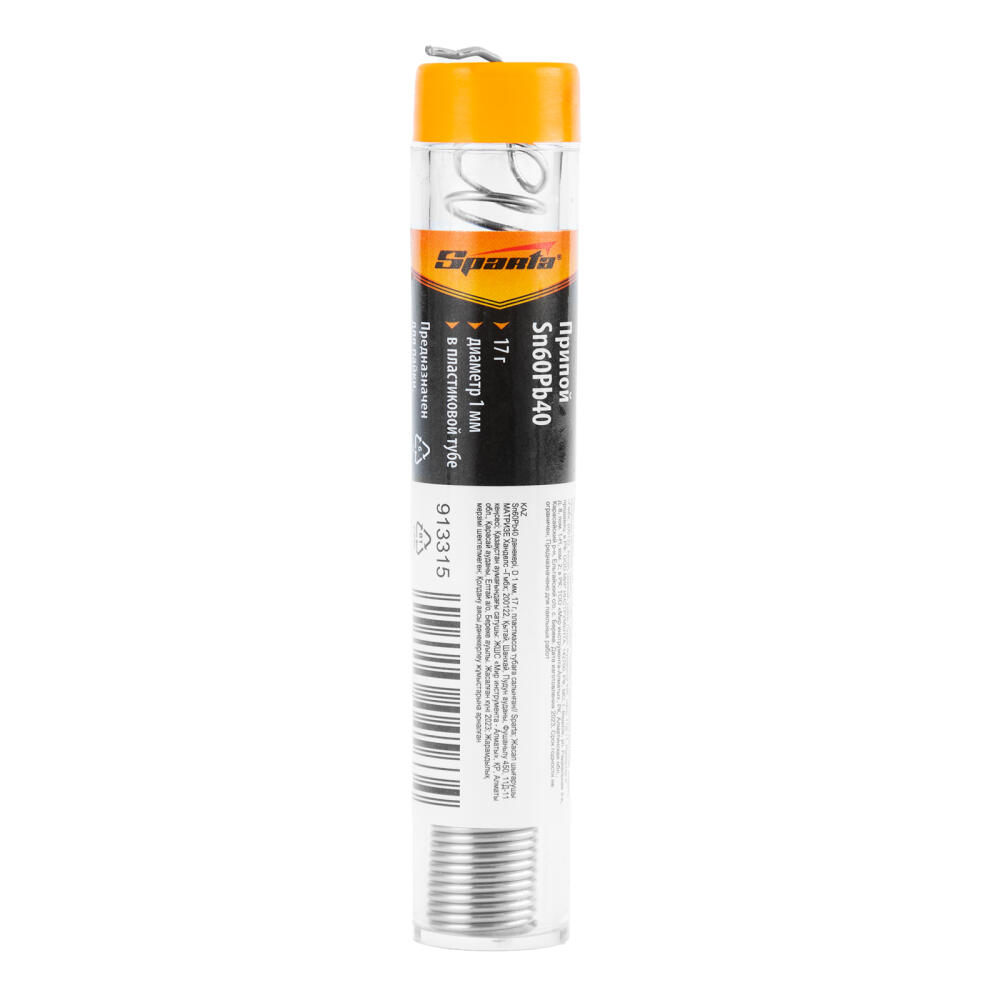 Припой Sn60Pb40 Sparta 913315 диаметром 1 мм, весом 17 г, поставляется в пластмассовой тубе и применяется для пайки материнских плат, тонких проводов и других компонентов. Состоит на 25% из олова и на 75% — из свинца. Пригодится радиолюбителям и мастерам по ремонту электроники.