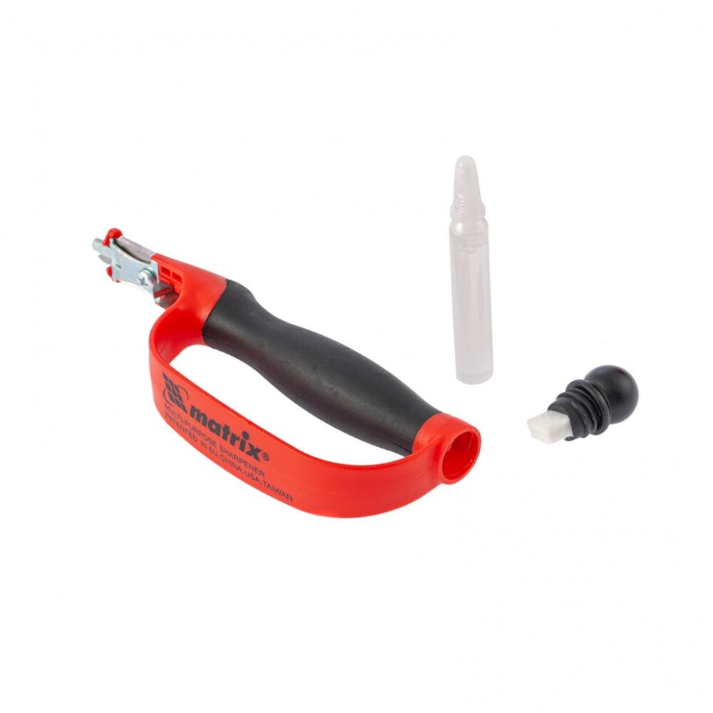 Многофункциональное приспособление для затачивания 6 в 1 Matrix 79103 восстанавливает остроту лезвий бытовых режущих инструментов — ножниц, кухонных, канцелярских и садовых ножей, кусторезов, секаторов и сучкорезов. Две пары точильных камней позволяют проводить заточку под нужным углом. Чтобы смазать лезвие, не нужно искать масленку и губку — они входят в комплект поставки. Ножеточка будет полезна в домашнем хозяйстве.