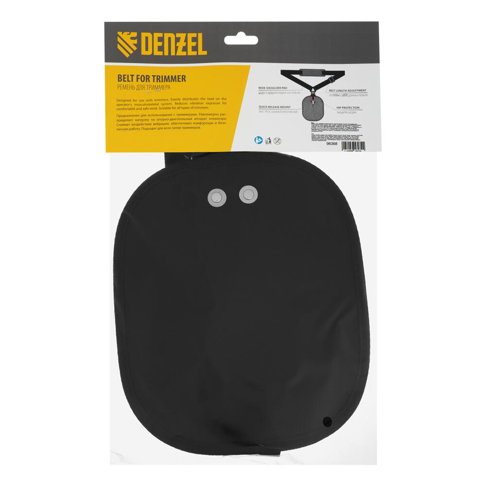 Универсальный ремень Denzel 96368 с защитой бедра предназначен для облегчения работы с триммерами. Он подвешивается на плечо, позволяя снизить нагрузку на руки, что удобно для выполнения работ средней продолжительности.