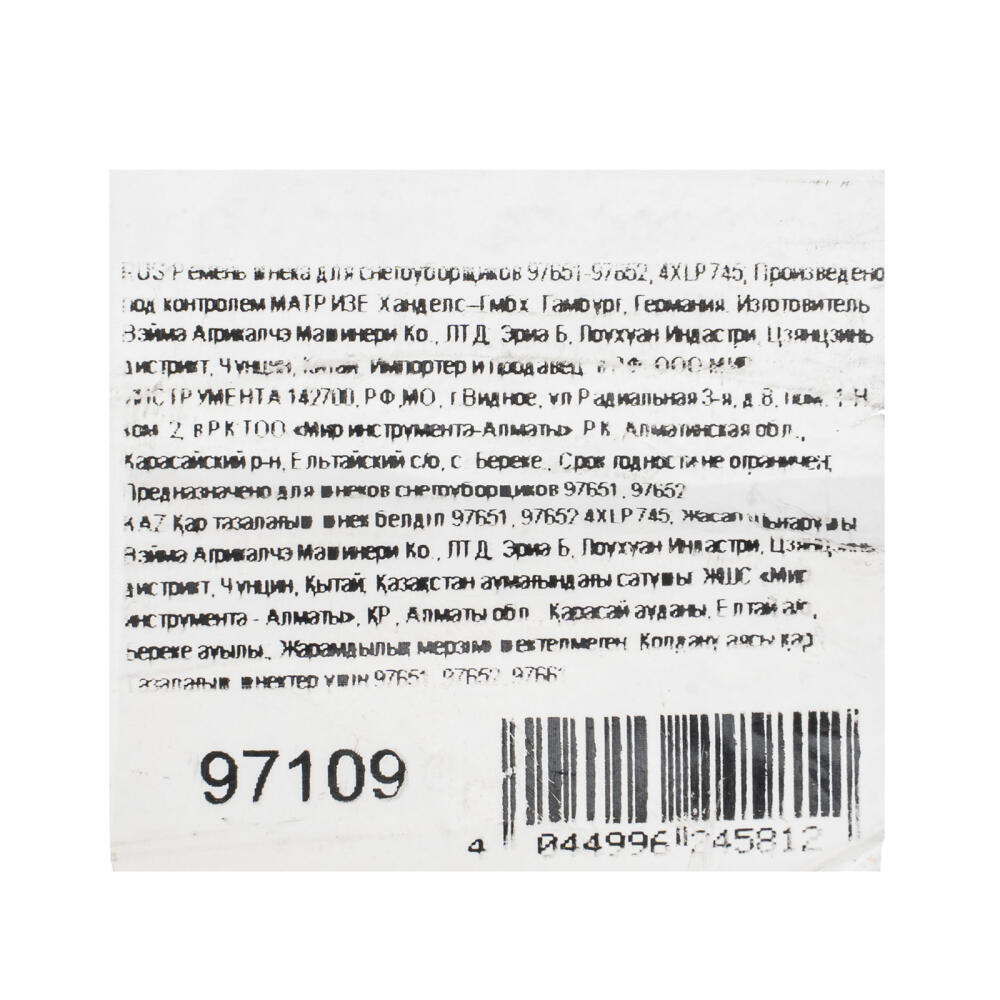 Клиновой ремень привода шнека 4XLP745 97109 используется в качестве запасного аксессуара для снегоуборочных машин SB 560 97651 и SB 560 LP 97652. Предназначен для передачи крутящего момента, позволяет восстановить работоспособность техники после выхода из строя старого ремня.
