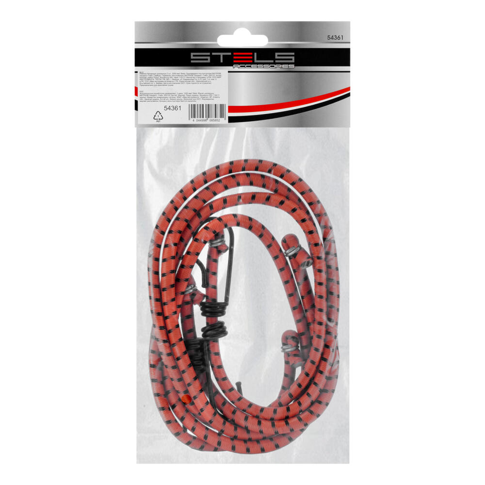 Усиленные багажные резинки Stels 54361, 2 шт. длиной по 600 мм, используются для перевозки грузов. С их помощью можно закрепить различные предметы в прицепе или багажнике на крыше легковой автомашины. Жгуты толщиной 8 мм изготовлены из резины с добавлением латекса, поэтому обладают высокой эластичностью и прочностью. Будут полезны автовладельцам.