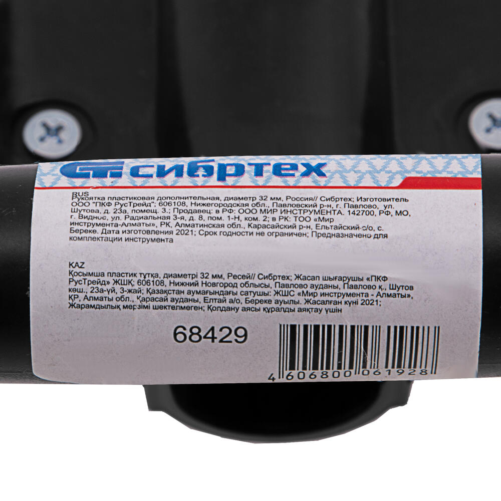 Пластиковая дополнительная рукоятка Сибртех 68429 устанавливается на черенок диаметром 32 мм, совместима с артикулами 68409, 68408, 68412, 68423 и 68424. Обеспечивает уверенный хват и позволяет работать со значительным усилием, воздействуя на инструмент не сбоку, а сверху. Может использоваться в холодное время года, т.к. изготовлена из морозостойкого полипропилена. Рукоятка пригодится для проведения работ на дачном участке, а также для уборки снега.
