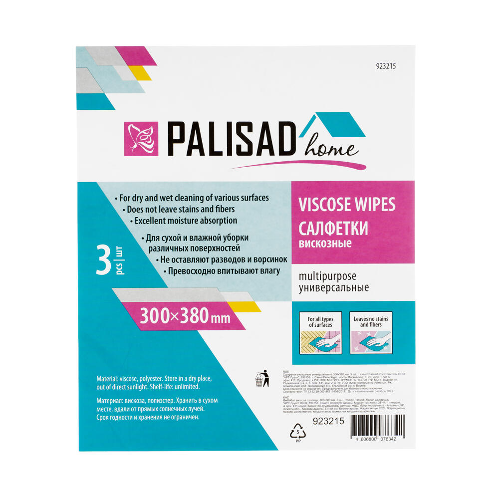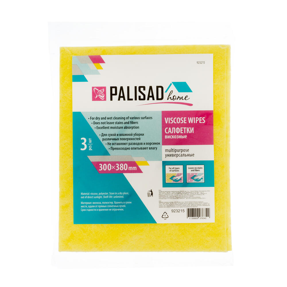Универсальные вискозные салфетки Palisad Home 923215 размером 300 х 380 мм, 3 шт. в упаковке, подходят для очищения любых поверхностей, в том числе деликатных: зеркал, мебели, сантехники и т. д. Они гораздо дешевле аналогов из микрофибры, но при этом также не оставляют следов и ворсинок.