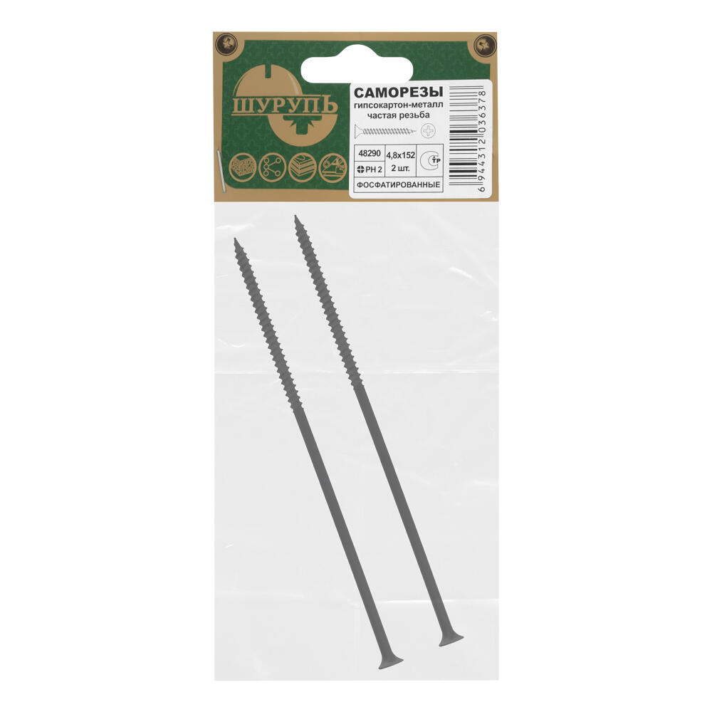 Саморезы по гипсокартону частая резьба, 4.8 х 152, PH №2, фосфатированные 2 шт Шурупь