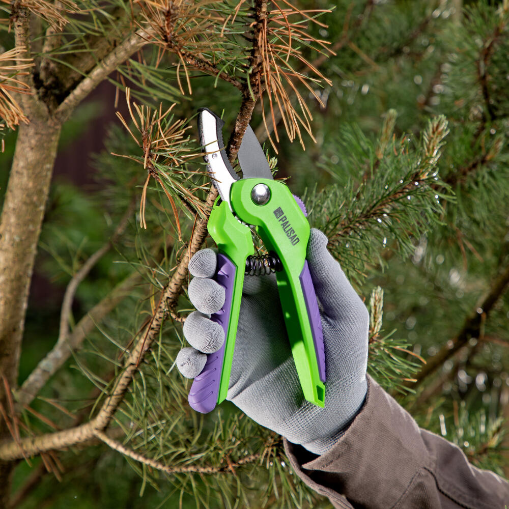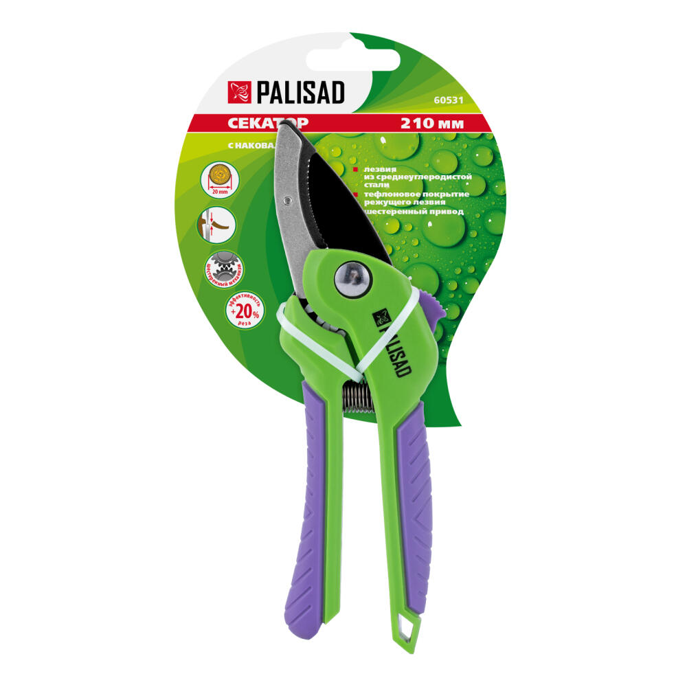 Секатор с наковальней Palisad 60531 длиной 210 мм, с шестеренным приводом и двухкомпонентными рукоятками, служит для щадящей обрезки сухих и увядших веток толщиной до 20 мм. С этой задачей он успешно справляется благодаря шестеренному приводу, увеличивающему усилие сжатия на 20%. Тефлоновое покрытие уменьшает трение лезвия и облегчает рез. Регулировочный винт позволяет контролировать плотность смыкания лезвий. Инструмент будет полезен на дачном участке.
