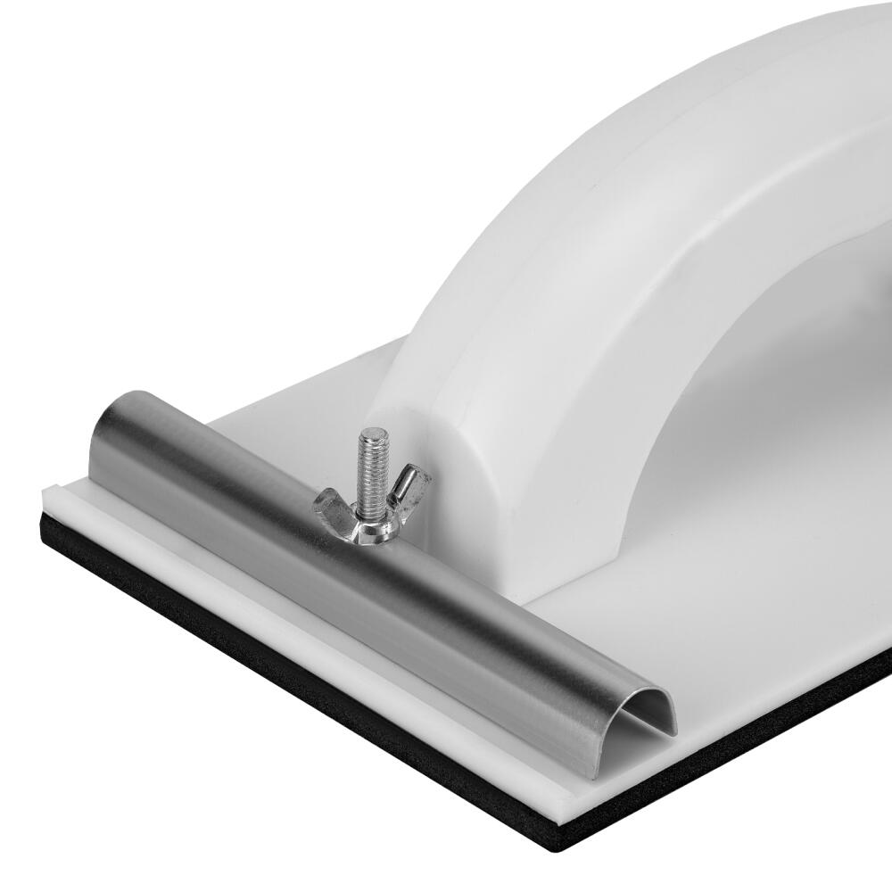 Пластиковый сеткодержатель Sparta 758515 с подошвой 230 х 120 мм, с зажимами, используется для ручного шлифования деревянных, шпатлеванных, металлических, пластмассовых и прочих твердых поверхностей. Сеткодержатель фиксирует абразивную стеклосетку или шлифлист и позволяет удалять старые отделочные покрытия, подготавливать поверхность под покраску, а также выполнять чистовую обработку.