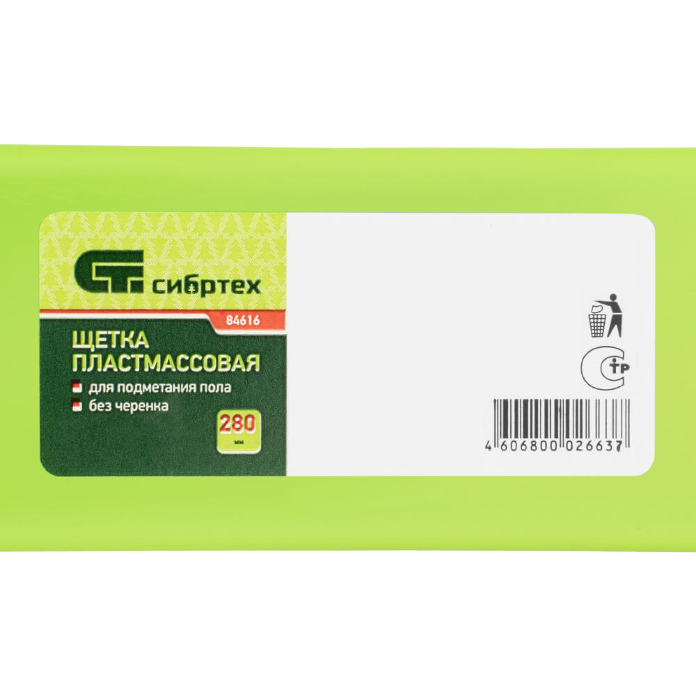 Пластмассовая щетка Сибртех 84616 длиной 280 мм, без черенка, предназначена для подметания пола. Подходит для паркета, линолеума, ламината, плитки и других видов напольных покрытий. Длинный ворс позволяет эффективно собирать пыль и мелкий мусор. Черенок приобретается отдельно, рекомендуемые модели — 93527, 93526, 93525, 93524.