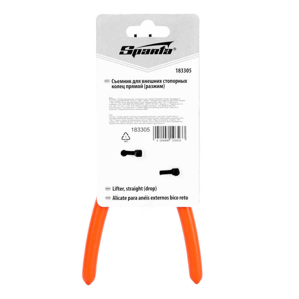 Прямой съемник Sparta 183305 длиной 150 мм — монтажный инструмент, работающий на разжим и использующийся для установки и снятия внешних стопорных колец с отверстиями. Благодаря продуманной конфигурации наконечники съемника надежно удерживают проушины кольца. Инструмент будет полезен мастерам по ремонту бытовой техники или автомобилей, а также пригодится в домашнем хозяйстве.