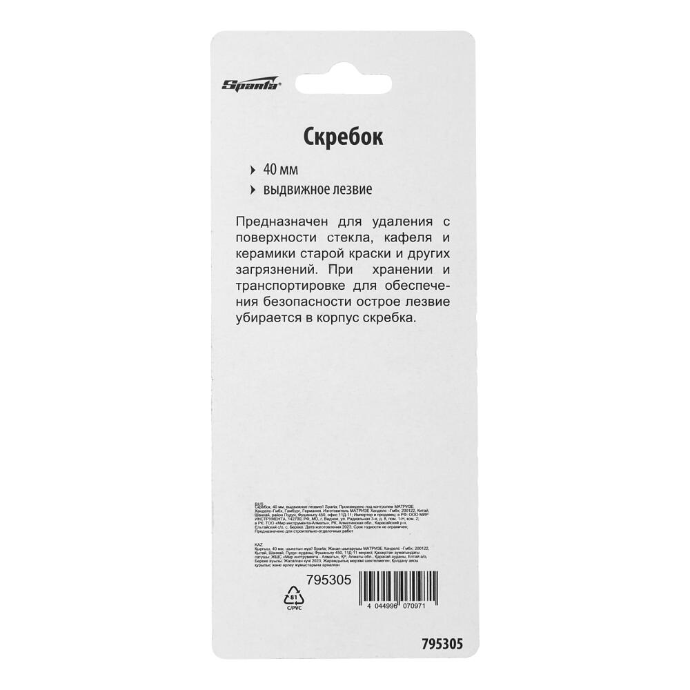 Скребок Sparta 795305 с выдвижным лезвием шириной 40 мм используется для выполнения ремонтных и отделочных работ. Эффективно очищает гладкие поверхности, удаляет загрязнения, а также остатки старой краски и строительных смесей. В случае износа полотно можно заменить, приобретать новый инструмент не нужно.