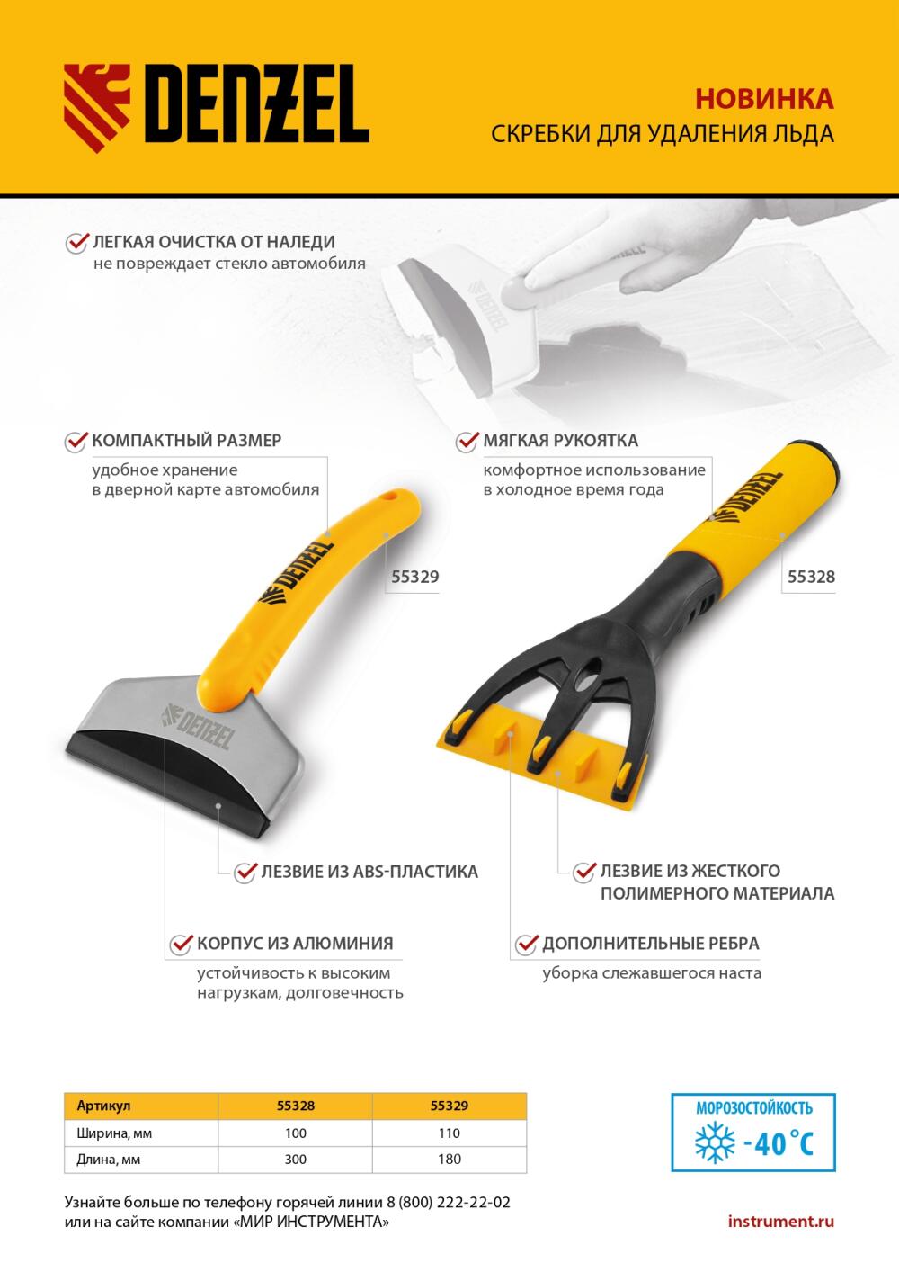 Усиленный скребок для удаления льда Denzel 55329 применяется для очищения зеркал и стекол автомобиля от налипшего и примерзшего снега. За счет небольшого размера 18 х 11 см скребок удобно хранить в салоне автомобиля.