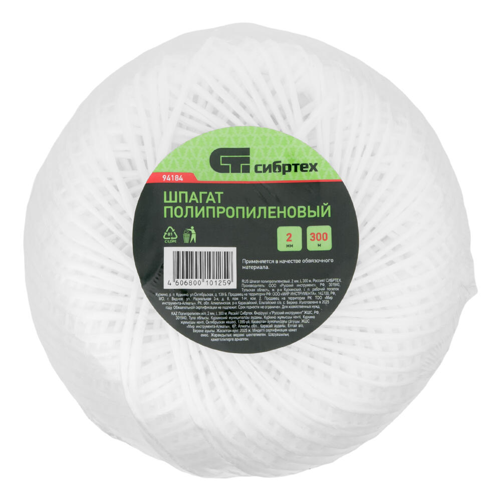 Полипропиленовый шпагат Сибртех 94184 длиной 300 м и толщиной 2 мм применяется для обвязывания упаковки. Пригодится в цехе, на складе, в гараже, будет полезен в быту. Полипропилен устойчив к разрыву и механическим нагрузкам, выдерживает многократные изгибы без риска повреждения.